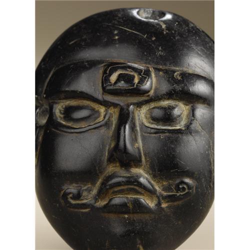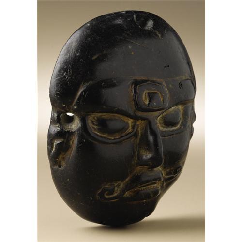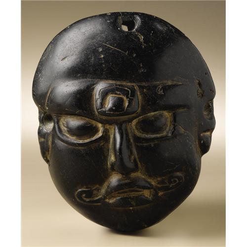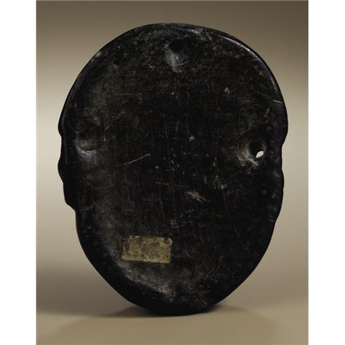 <B>Face Mask</B></I><BR>Maya (Pre-Classic or Early Classic)<BR>A.D. 250 - 550<BR>Black stone, traces of red pigment<BR>Height 5 5/8 in. Width 4 5/8 in.<BR><BR>The size and weight of this black stone mask suggest that it was either for a royal belt or to be tied to a shrine effigy. The ambiguous iconography and the uncertain treatment of the mouth scrolls both suggest a relatively early date, perhaps even before the Early Classic was under way. Traces remain of red pigment which once covered the mask. There are a number of small natural flaws in the stone, and the center of the back has old vertical scratches.<BR><BR>Provenance<BR>Dylan Graeme<BR>Dr. Wally and Brenda Zollman, Indianapolis<BR>Butterfields & Butterfields, San Francisco: sale 7307E, 25 March 2002, lot 5110, p.32, ill. p.32<BR><BR> <BR><BR><B>Imp