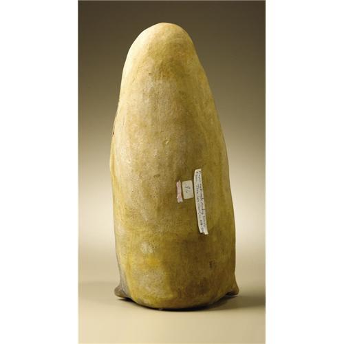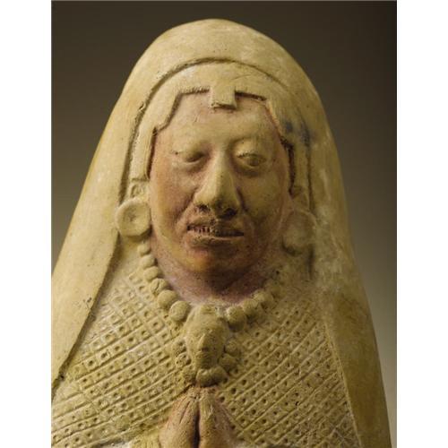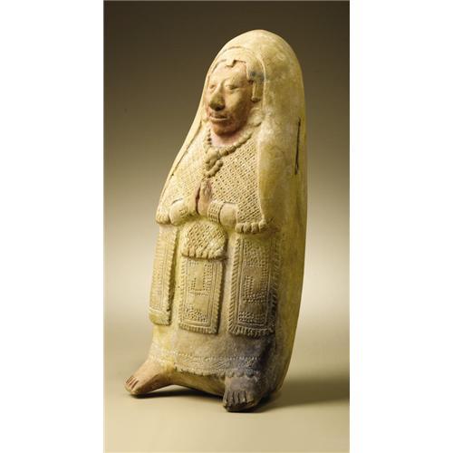 <B>Figure of a Standing Woman</B></I><BR>Maya, Jaina<BR>A.D. 550 - 900<BR>Ceramic, traces of original red paint<BR>Height 10 5/8 in. Width 4 7/8 in.<BR><BR>Although mold-made, the details are unusually refined and sharp in this standing female figure. Her hands are held palms together in a respectful gesture and point upward to a well-rendered head pendant at the center of her bead necklace. Ear spools and multi-banded, segmented bracelets complete her jewelry. Her hair is cut in the notched fashion often seen in Maya female representations. A simple, long mantle covers her head and falls full-length at her back and sides. Her upper body is covered with a <I>huipil</B></I> shown as having a textured weave of squares centered with circles and its bottom edge rimmed by pom-poms. A three-part fringed garment hangs over her skirt from under the <I>huipil,</B></I> its punched patterning suggesting that it may have been a gauzy semi-openwork weave. A textured band finished in fringe is at the bottom of her skirt, from which her bare feet show. Other than several patches at the lower rear the overall condition is excellent.<BR><BR>Provenance<BR>Sotheby's New York: sale 4749Y, December 1981, Lot 204<BR>John-Platt Collection (Daniel M. Friedenberg)<BR>Sotheby's New York: sale 7902, 15 May 2003, Lot 257, p.176<BR><BR>Published<BR>Von Winning, Hasso, <I>The John-Platt Collection of Pre-Columbian Art.</B></I> Charlottesville: the University of Virginia Art Museum, 1986, p.67, Fig. 125<BR><BR>