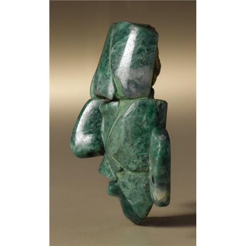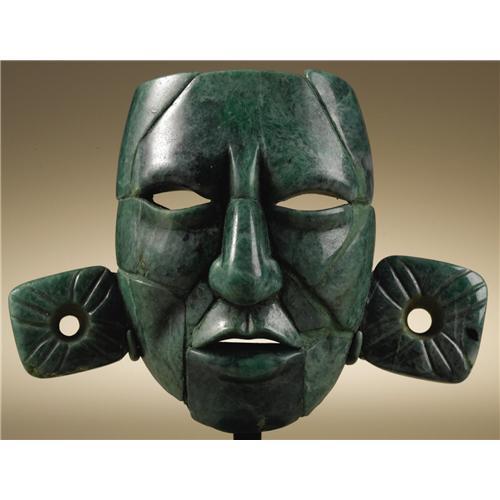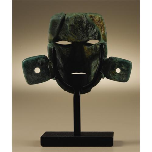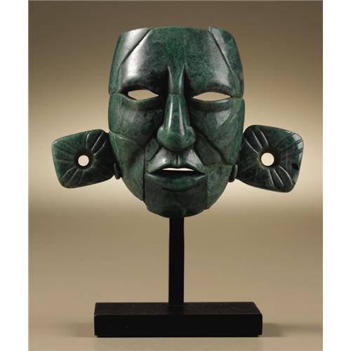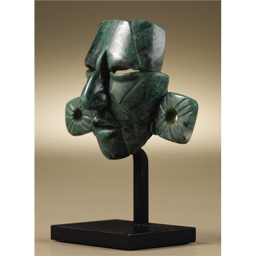 <B>Mosaic Portrait Maskette</B></I><BR>Maya<BR>A.D. 600 - 800<BR>Jadeite, Weight 58 grams<BR>Height 2 5/16 in. Width 3 1/16 in.<BR><BR>Among the Maya portrait masks in sizes ranging from life-sized to miniature were constructed on wood matrices as mosaics comprised of jadeite and other valued and beautiful materials. Many of these, such as this splendid example, are vividly portrait-like. Life-sized masks found in several excavated burials confirm the portrait intent for those examples. Though small, the present mask projects vital energy, as well as being made up of particularly carefully shaped and fitted individual pieces. One cannot help noticing a tantalizing resemblance to the famous life-sized mask from Pakal's tomb at Palenque. Though reassembled on a modern backing, the condition of the all original components is excellent.<BR><BR>Provenance<BR>Murray Korda, Orwell, Vermont<BR>Splendors of the World, Haiku, Hawaii<BR><BR> <BR><BR><B>Important notice:<