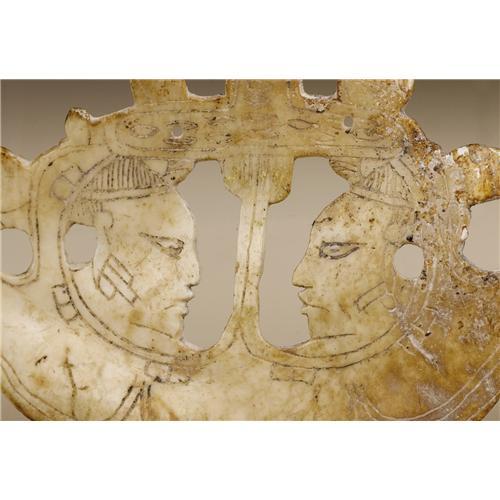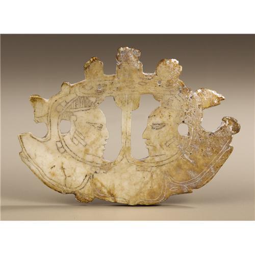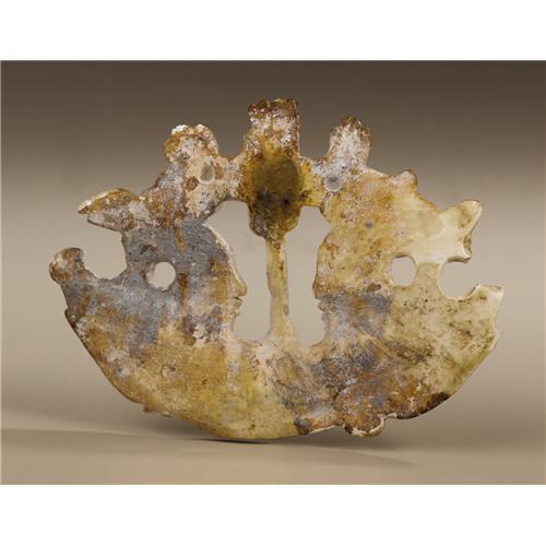 <B>Openwork Pectoral of Two Facing Dignitaries</B></I><BR>Maya<BR>A.D. 550 - 800<BR>Shell<BR>Height 2 7/8 in. Width 3 15/16 in.<BR><BR>The frequency with which Maya pectorals in pale-colored shell have openwork areas suggests that they may have been conceived for use against a material of stronger color. Only then would the silhouetting of image have achieved full impact. For this case, all of the solid elements of the pectoral combine to suggest a large-eyed, agnathic frontal face. This is enhanced by the finely incised double lines at the arched lower edge which define three lobed forms, the middle one having a slight downward dip at its center which reinforces the suggestion of a nose seen frontally.<BR>The solid forms show two male profiles facing inward toward one another, with a column separating them. Fine encircling incised outlines indicate that the heads appear behind a front plane, as though seen inside the eyes of the mask.<BR>There are various chips along the edges, the center bar was broken at top and bottom and has been reglued, and there are old breaks at the right and left ends, with resulting missing parts. There are dirt encrustations and stains on the back.<BR><BR> Provenance<BR>Bonhams & Butterfields, San Francisco: sale 7546E, 14 June 2004, lot 1033, p. 11 (Property from the Tara Colburn Estate, Los Angeles)<BR><BR>
