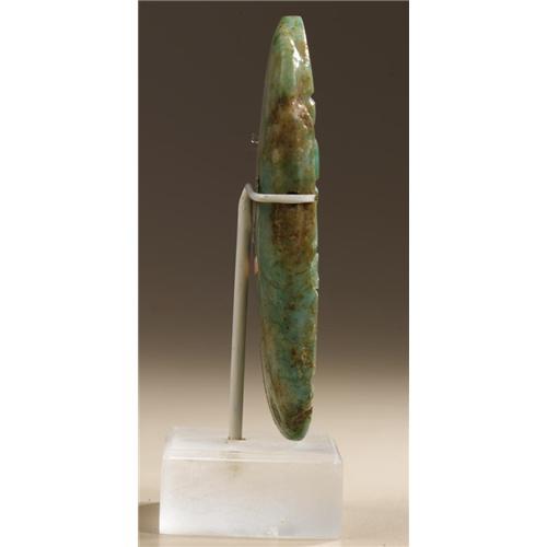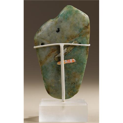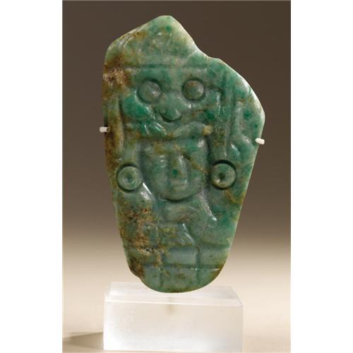 <B>Pendant Depicting a Half-Figure Wearing a Feline Headdress</B></I><BR>Maya<BR>A.D. 550 - 800<BR>Jadeite, Weight 128 grams<BR>Height 3 7/8 in. Width 2 3/8 in.<BR><BR>The irregularly-shaped, relatively flat jadeite pendant has a low relief representation of a male half-figure wearing a feline headdress that appears to engulf the wearer's head within its open mouth. The animal is most likely to be a jaguar, a frequent <I>way</B></I> (spirit companion) of kings. Below the headdress ear spools are visible. The man's right arm rests against the chest along a belt, with the open-handed left arm diagonally above it so that the hand is below his chin. The jadeite's primary color is a light apple green, with some brownish and grayish mottling. Condition is very good, with diagonally drilled holes running from side to back at either side of the pendant.<BR><BR>Provenance<BR>The Bogousslavsky Collection<BR>Sotheby's, New York: 4 December 1981, lot 71<BR>John-Platt Collection (Daniel M Friedenberg)<BR>Sotheby's, New York: sale 7902, 23 May 2003, lot 298, p.192<BR><BR>Published<BR>Von Winning, Hasso, <I>The John-Platt Collection of Pre-Columbian Art,</B></I> Charlottesville: The University of Virginia Art Museum, 1986, fig.170, p.85<BR><BR>