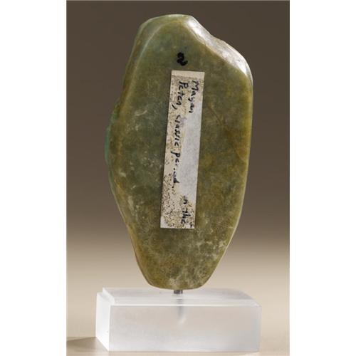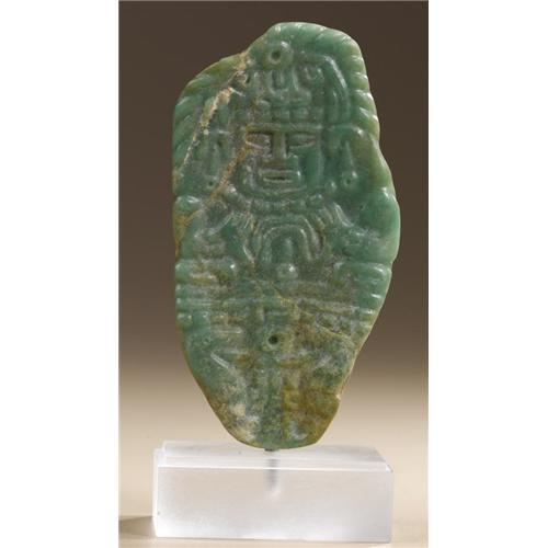 <B>Pendant of an Enthroned King</B></I><BR>Maya<BR>A.D. 550 - 800<BR>Jadeite, Weight 98 grams<BR>Height 3 3/4 in. Width 2 1/8 in.<BR><BR>Roughly long oval in outline, this thin jadeite pendant shows an enthroned king viewed from the front. The requirements of jade-working technique force a number of simplifications which challenge interpretation. However, the strongest probability is that the ruler cradles in his arms an arched vision-serpent bar, below which is visible a double-band belt having a central emblem and bordered by pendant oliva shells. Hanging between the parted legs is the ruler's elaborate breechcloth. The headdress shows a frontal animal head with bared teeth and the curled eyes associated with several deities. Above this head feathers fan out from a central circular medallion. Three-part ear spools, a necklace, bracelets, and anklets complete the royal Maya regalia.<BR>Seen from the side, it is apparent that the ancient artist carefully selected a bright green jadeite layer lying atop a duller brownish-green layer; shallow saw marks suggest that he considered trying to separate this brighter layer from the rest, but rejected the idea. The piece is drilled through from side to side and from top to bottom.<BR><BR>Provenance<BR>Peter Wright, Florida (acquired 1970)<BR>Daniel M. Friedenburg Collection<BR>Sotheby's, New York: sale 7902, 15 May 2003, lot 298, p.192<BR><BR>