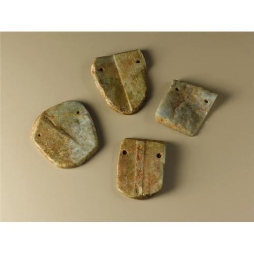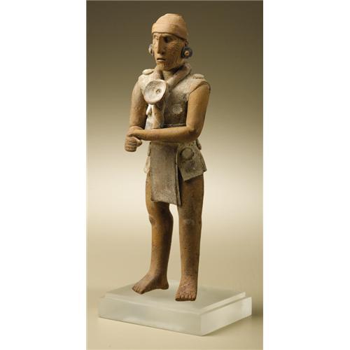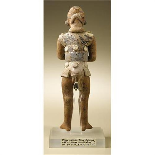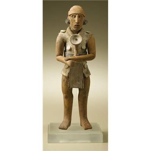 <B>Standing Male Figure with Left Hand on Right Wrist</B></I><BR>Maya, Jaina<BR>A.D. 550 - 900<BR>Ceramic, traces of original paint<BR>Height 8 in. Width 2 5/8 in.<BR><BR>The figure stands stiffly on long-calved legs, looking straight forward with an almost blank stare. His left hand rests lightly on his right at waist level where the bent arms meet. He wears what may have been a short sleeveless tunic gathered at the waist by a wide belt with a flap folded to extend downward at front center almost to the knees. The lower edge of the tunic was cut at several points to allow ease of movement. Circular appliqué tabs decorate both front and back of the tunic, over which a large coil-form necklace supports a concave circular piece, which once had something attached at its center. He wears two-part ear spools, and a stocking-cap-like head covering secured by a band tied at back. An element that once capped the head covering is broken away.<BR>Delicate and finely rendered facial tattooing is of special interest. A possible inward-facing but simplified serpent head marks either temple-cheekbone area, while a skeletal jaw complete with articulation points and teeth, is defined along either jaw.<BR>Overall condition is good, with considerable remaining post-firing Maya blue and white paint. There are metallic deposits on the back.<BR><BR>Provenance<BR>Sotheby's New York: sale 7900, 15 May 2003, Lot 256, p.175<BR><BR>