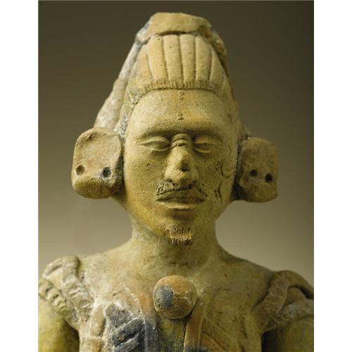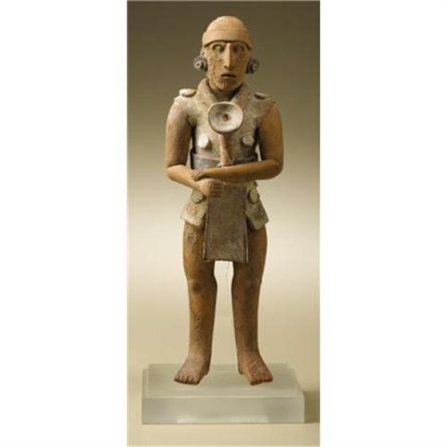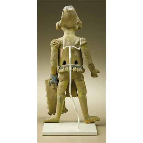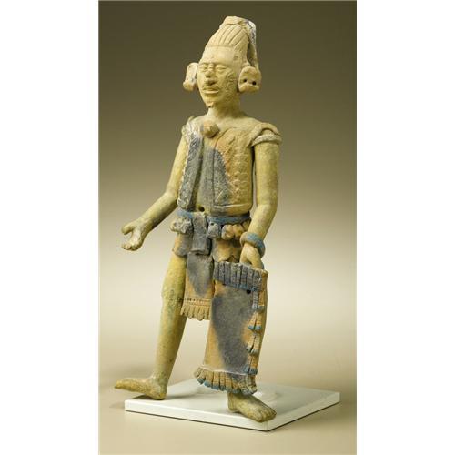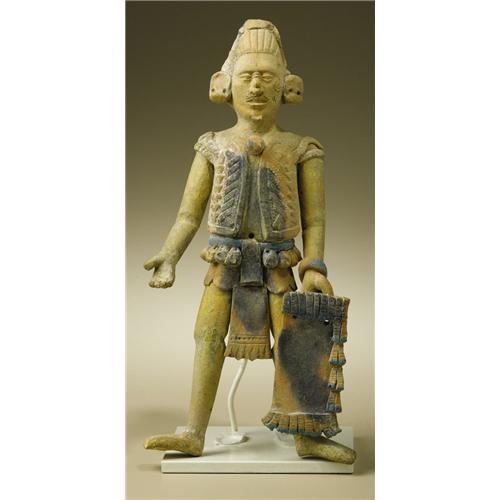 <B>Standing Warrior Holding Rectangular Shield</B></I><BR>Maya, Jaina<BR>A.D. 550 - 900<BR>Ceramic, traces of paint<BR>Height 9 1/2 in. Width 4 1/2 in.<BR><BR>Standing in a position of challenge with legs well apart, the warrior holds in his left hand a flexible rectangular war shield. He wears a bolero jacket with textured mat and other patterns and openwork shoulders. A large single bead is at the neck. Oliva shells are suspended from a waist band, lying over a short scalloped kilt and loincloth. The man's hair is pulled up to a topknot, with the rest of his hair and head accoutrements missing. A Maya scarification knob is added to his nose bridge, along with a clipped moustache and a short goatee. His ear ornaments are glyphic. Areas of original blue, yellow, and white paint remain. Finger and thumb tips are missing from his right hand and his right foot is replaced.<BR><BR>Provenance<BR>John-Platt Collection (Daniel M. Friedenberg)<BR>Sotheby's, New York: sale 7902, 15 May 2003, Lot 254, p.175<BR><BR>Published<BR>Von Winning, Hasso, <I>The John-Platt Collection of Pre-Columbian Art,</B></I>Charlottesville: The University of Virginia Art Museum. 1986, p. 66, Fig. 123<BR><BR>