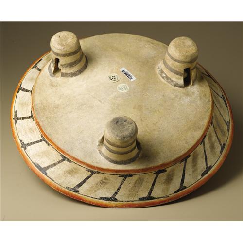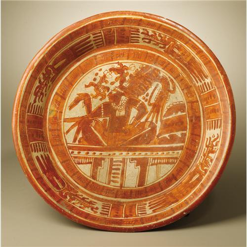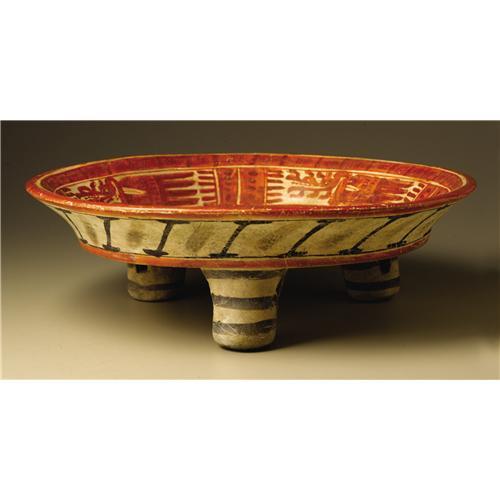 <B>Tripod Plate Showing a Seated Lord in its Central Medallion</B></I><BR>Maya<BR>A.D. 550 - 800<BR>Polychrome ceramic<BR>Diameter 14 in.<BR><BR>As one looks down onto this well-preserved tripod plate, a lord facing and gesturing to his right is shown seated cross-legged on a throne. There is a large cushion at his left, which may be making visually explicit an actual throne back. The tall, freely painted headdress shows a grinning, large-eyed deity mask with an upward-curving snout. Feathers turn back and down from the top of the headdress. On the sloping vessel wall four profile stylized cormorants, all facing in the same direction the lord looks, are separated by vertical dividers. On the exterior there is a repeated series of diagonal I-shaped bands, and the tripod legs have three horizontal black stripes. The plate is in the Holmul area painting style, which utilizes subtly nuanced tones of red slip to realize the images (Dorie Reents-Budet. <I>Painting the Maya Universe: Royal Ceramics of the Classic Period.</B></I> Durham and London: Duke University Press,1994, pp.180 ff.). Clay rattles remain in the hollow legs. There are some root marks, along with a small rim chip on the underside.<BR><BR>Provenance<BR>Christie's, Paris: sale 5057, 12 June 2003: Lot 622, p. 184<BR><BR>
