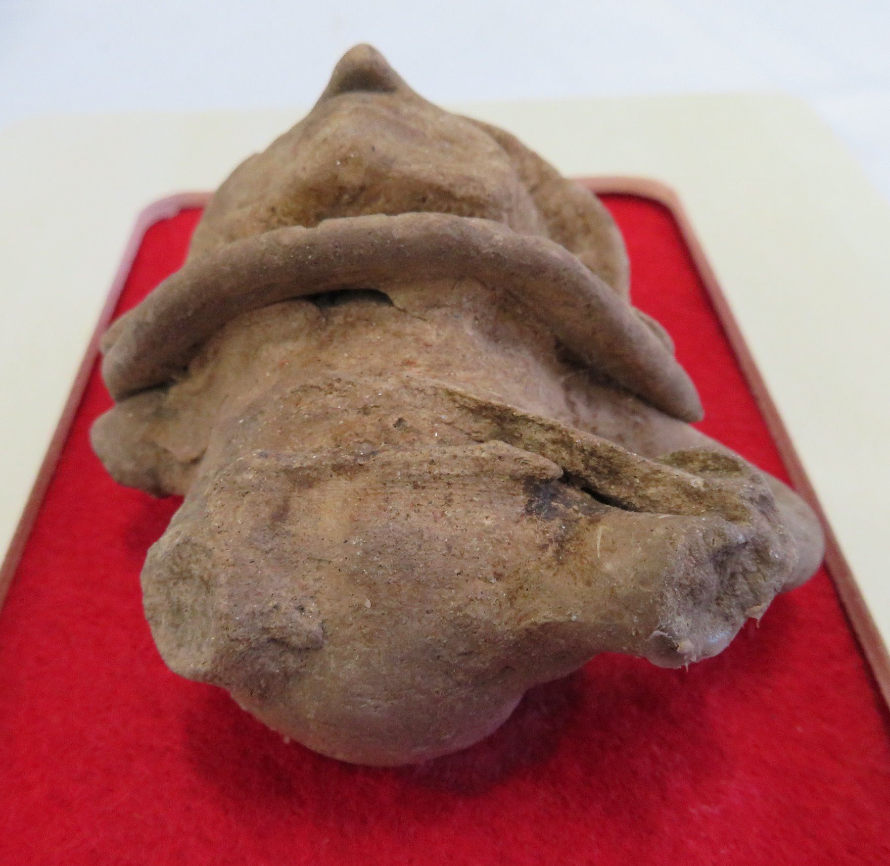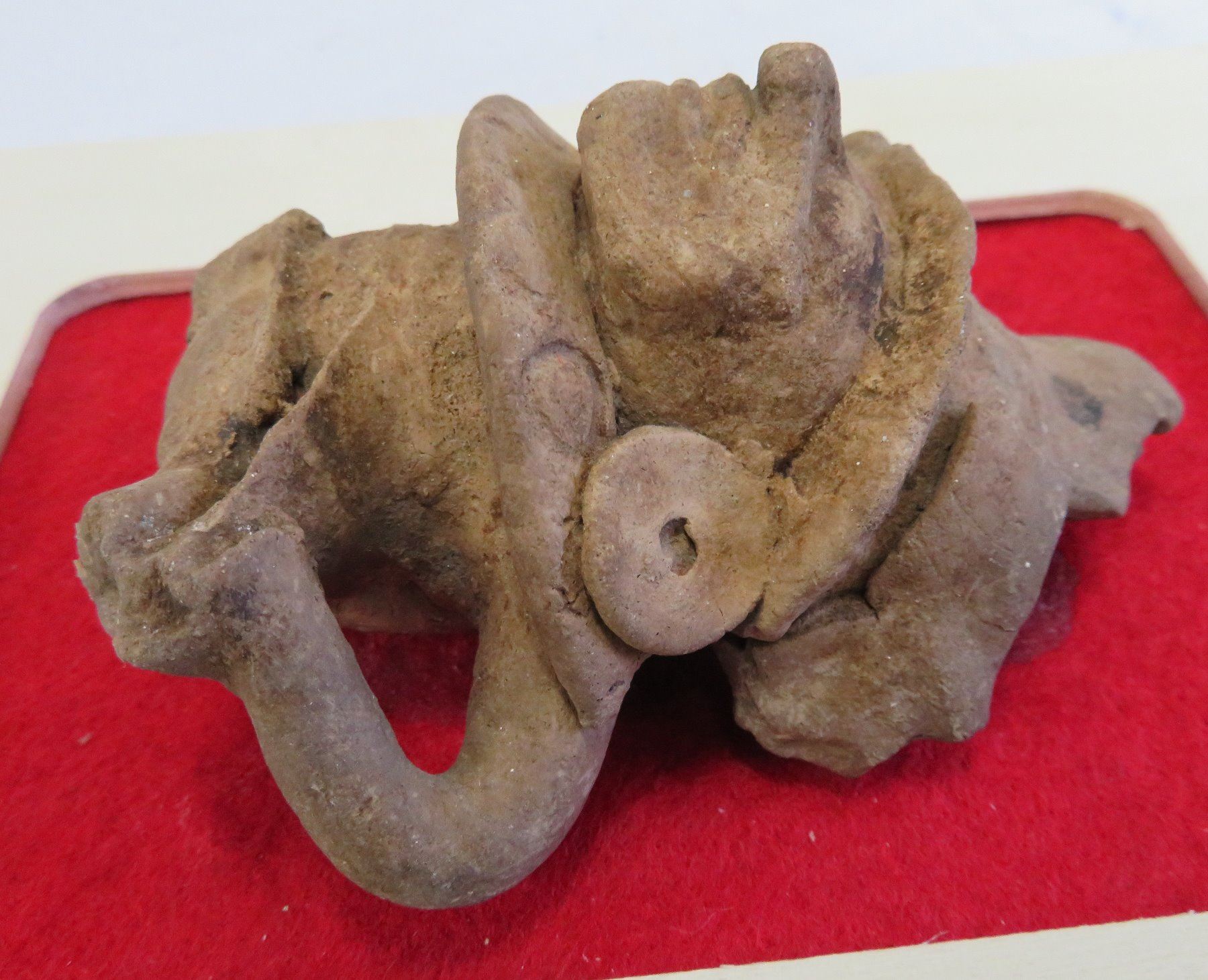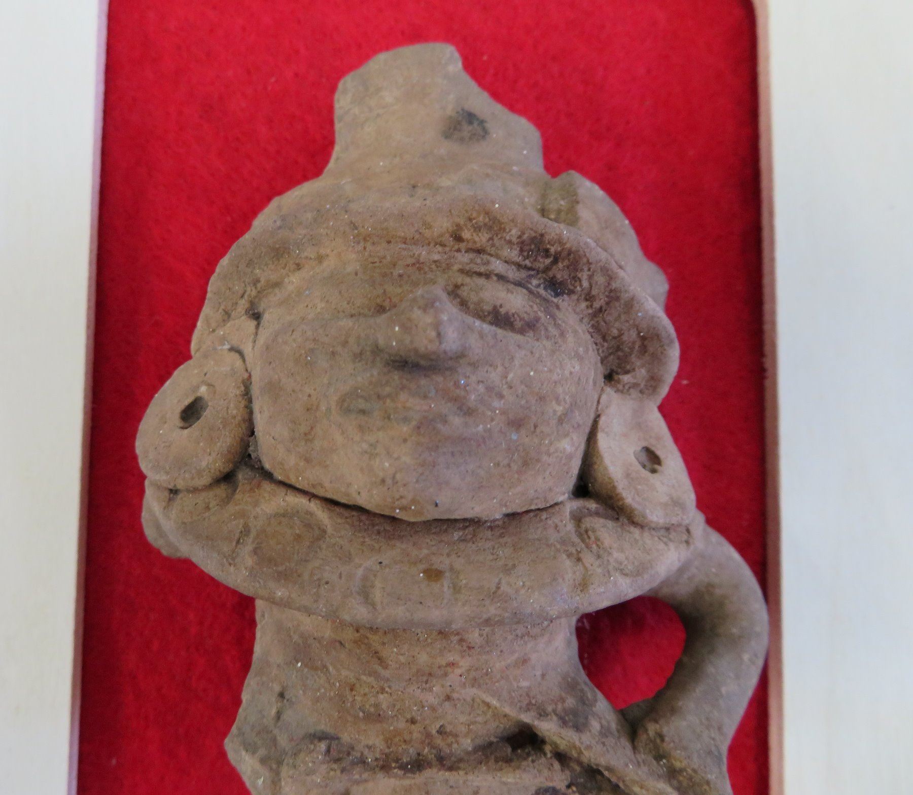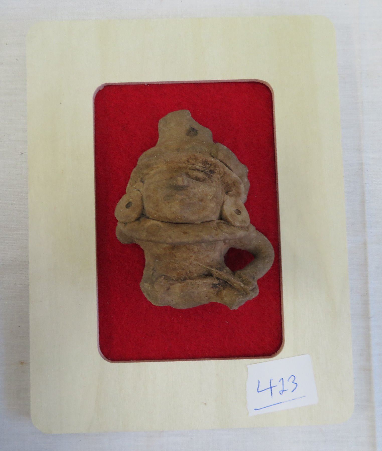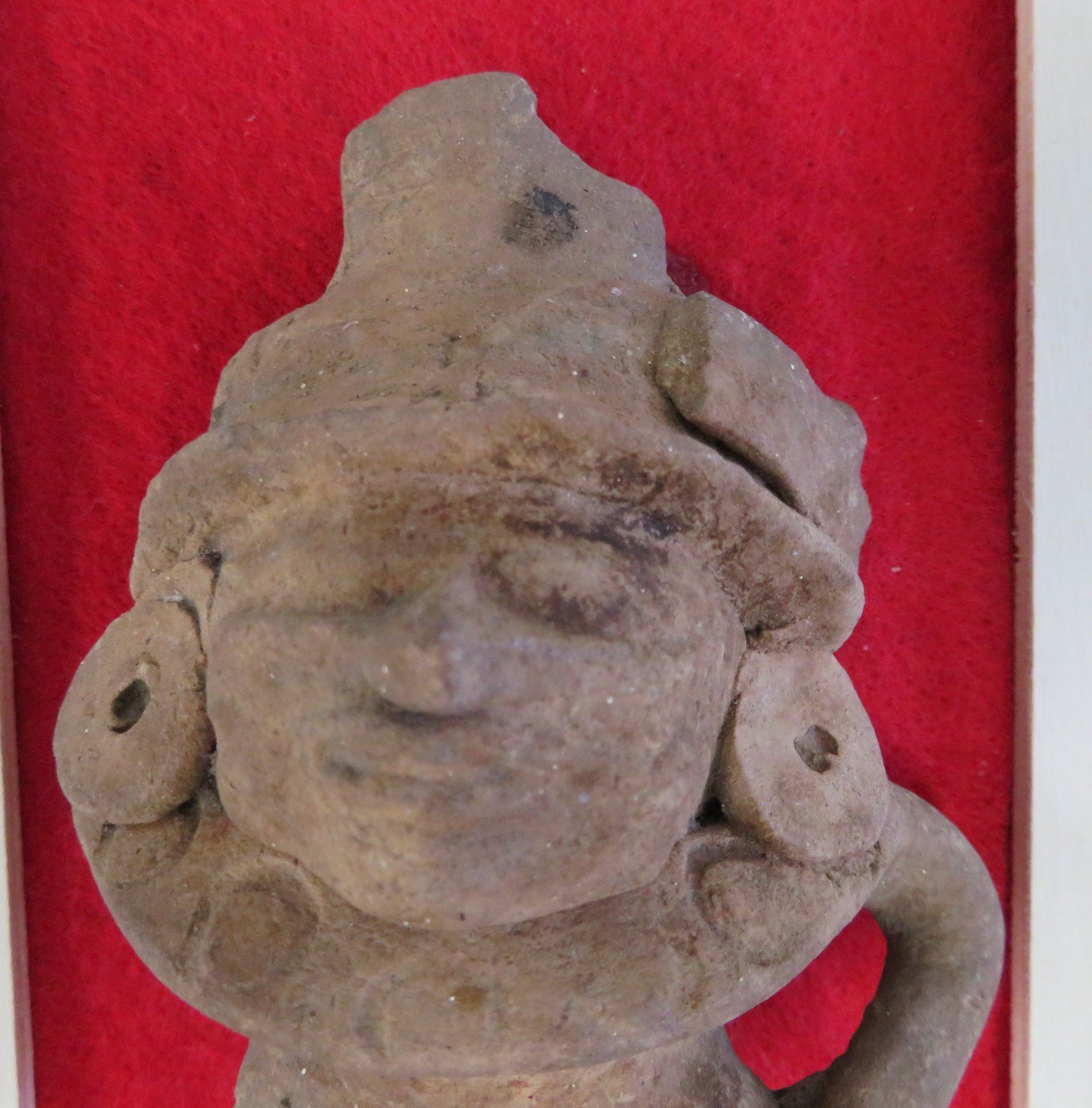 Mayan Clay Figure, pre-Columbian item. Made of clay on frame, the item measures 4" x 3" x 2". Guatemala. Frame included. Condition: Arm and legs missing, see images. Shipping: $20.00 w/insurance and signature.