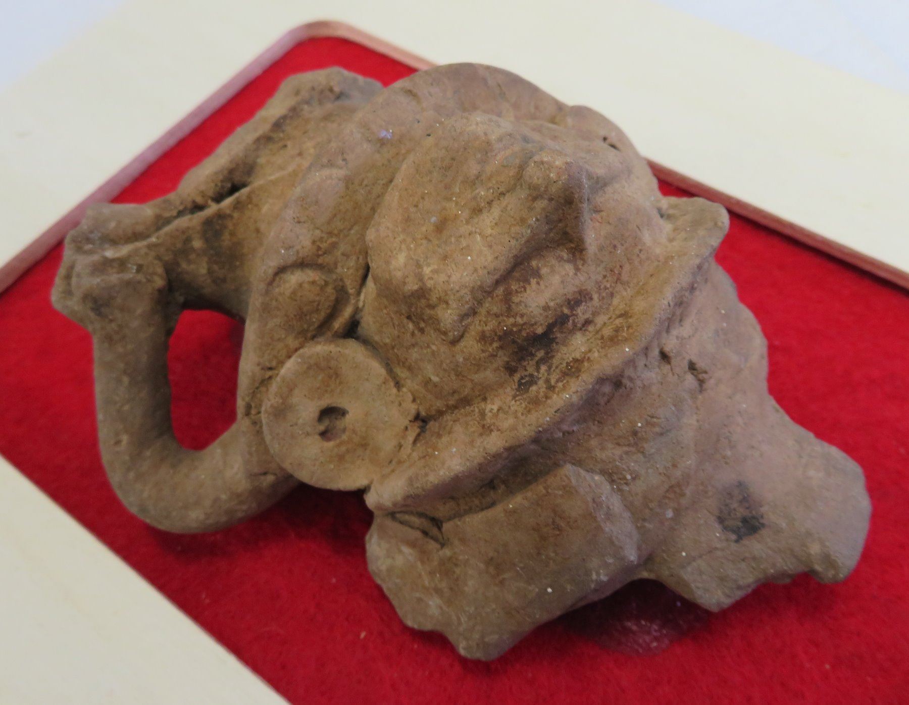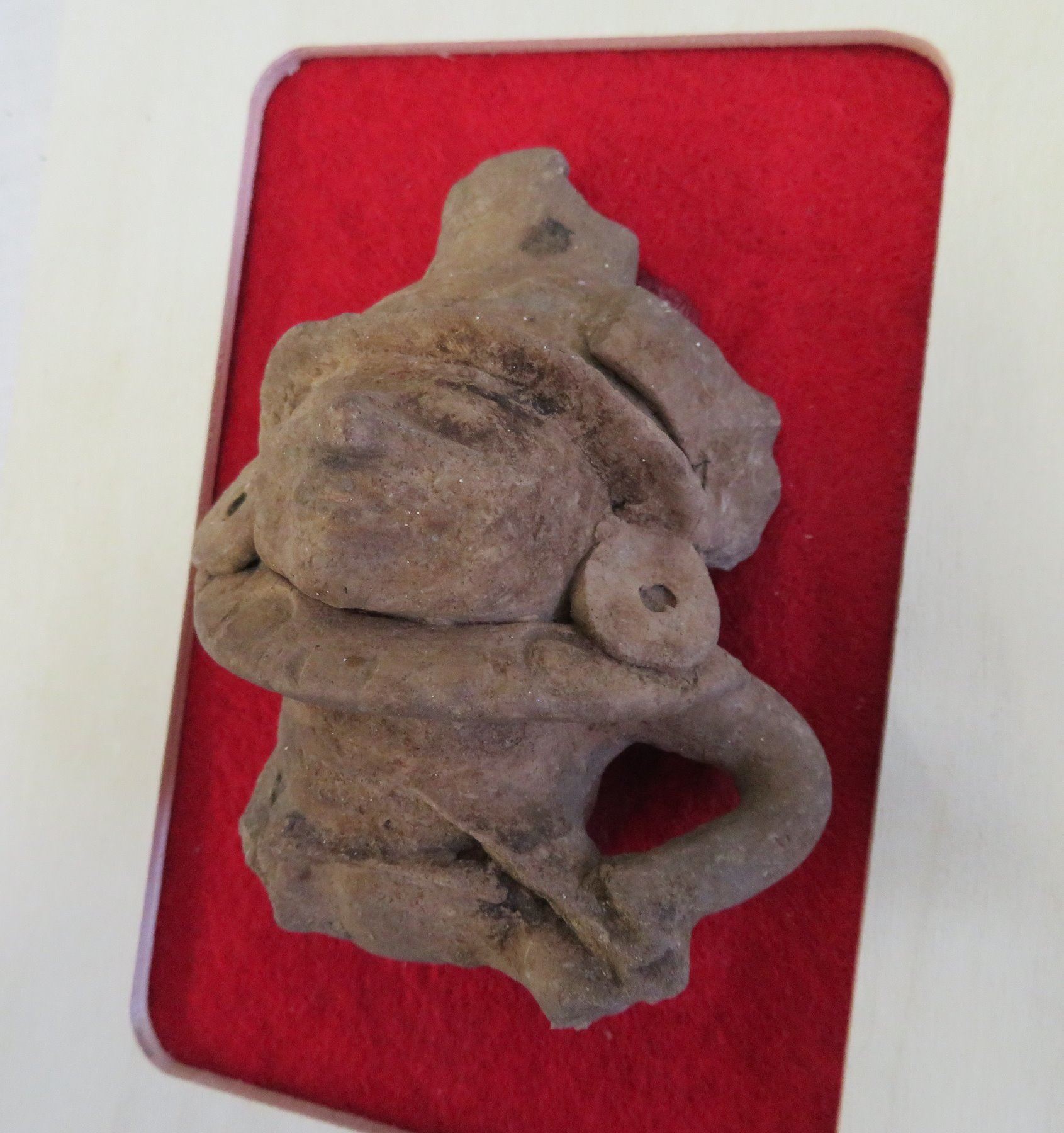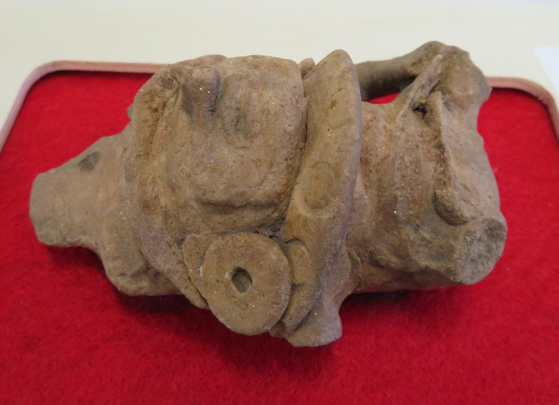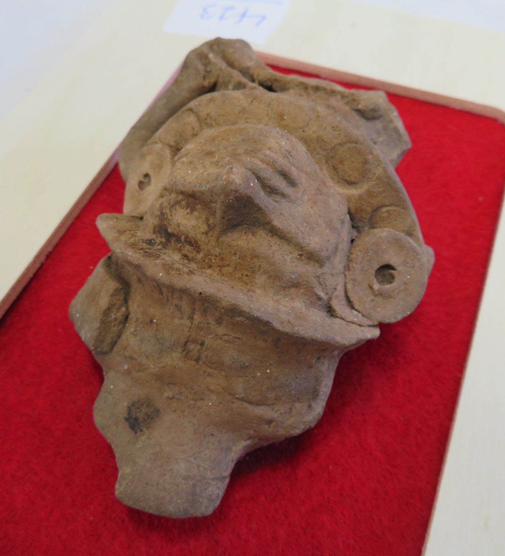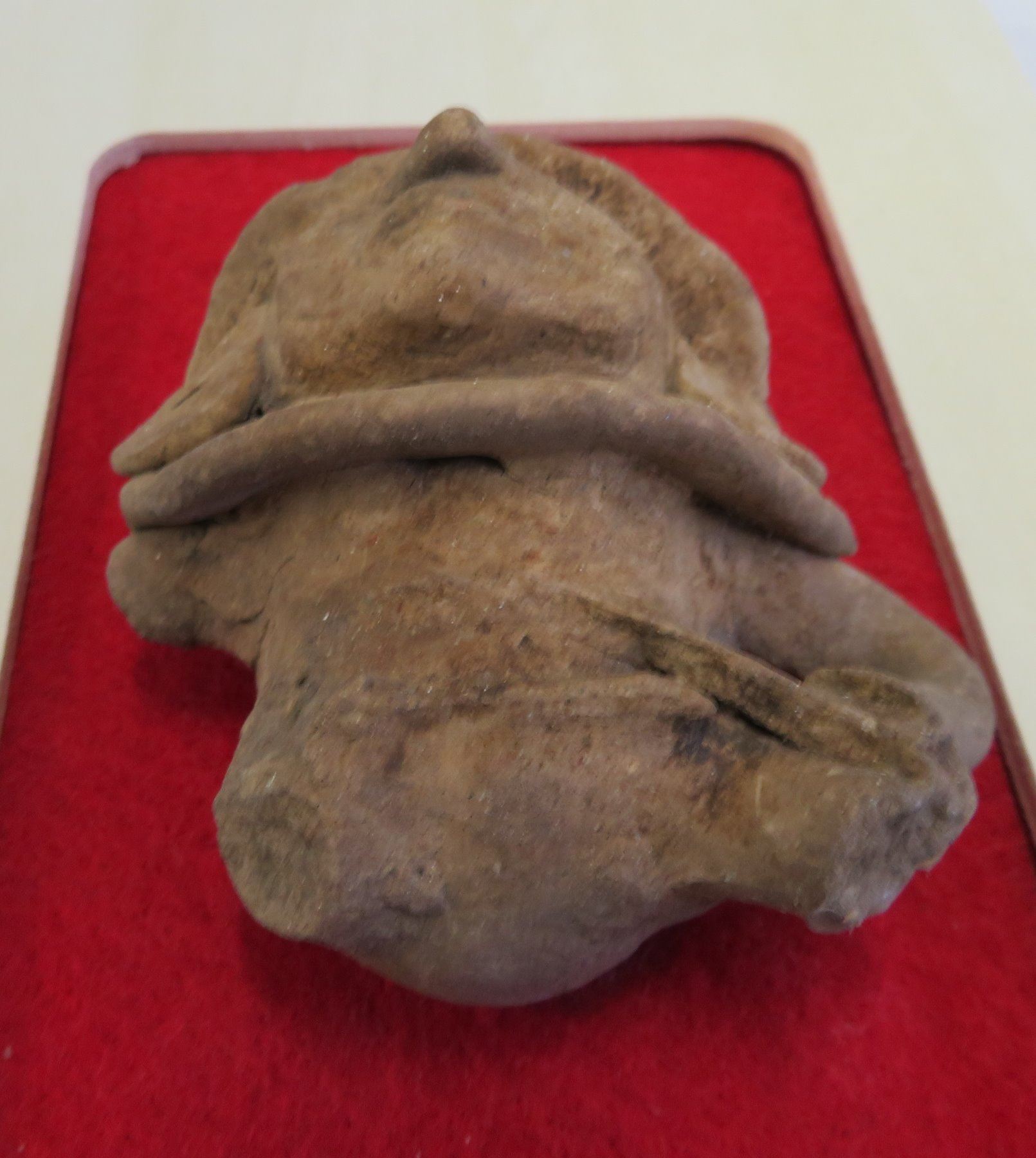 Mayan Clay Figure, pre-Columbian item. Made of clay on frame, the item measures 4" x 3" x 2". Guatemala. Frame included. Condition: Arm and legs missing, see images. Shipping: $20.00 w/insurance and signature.