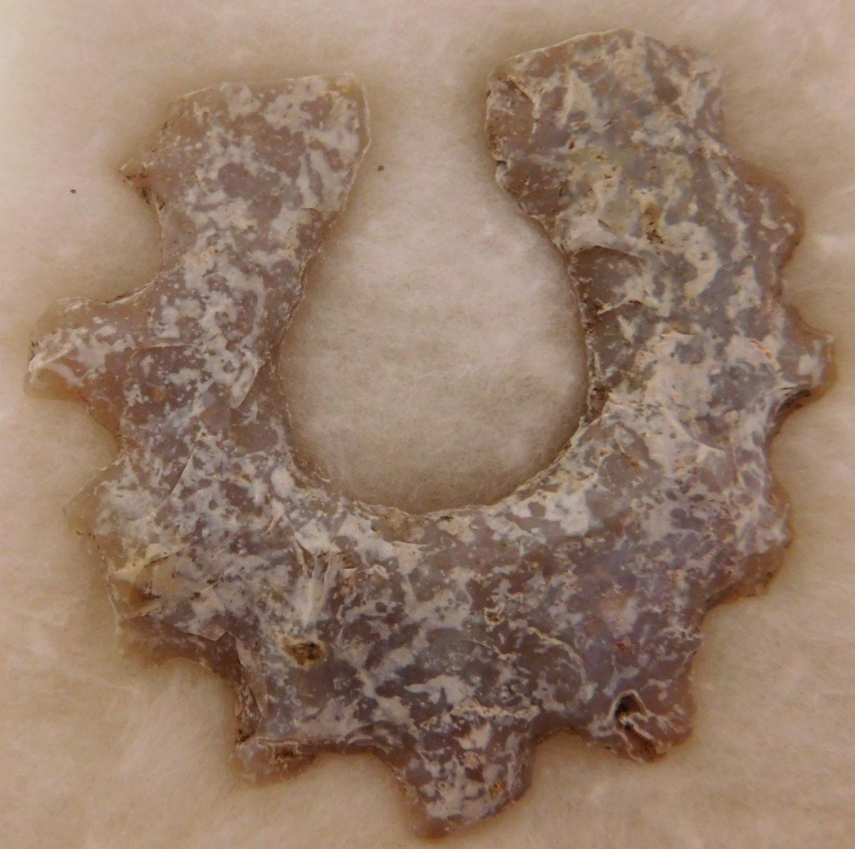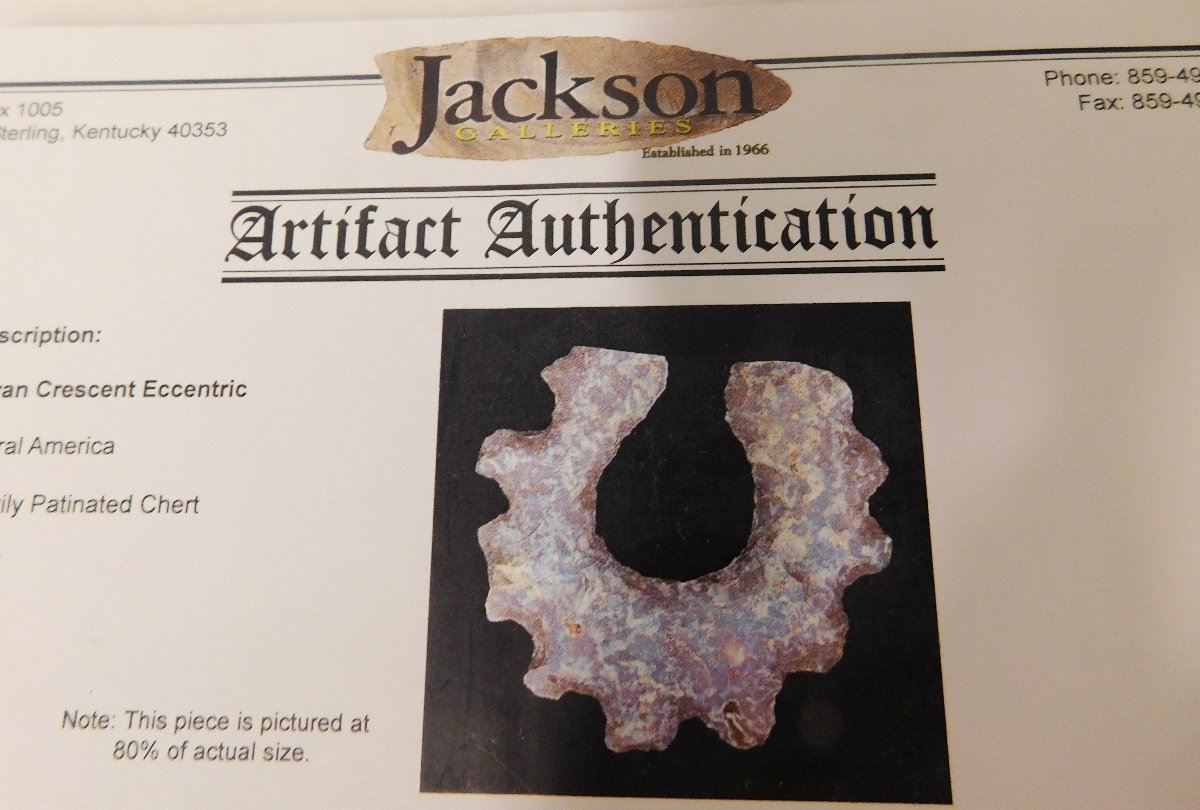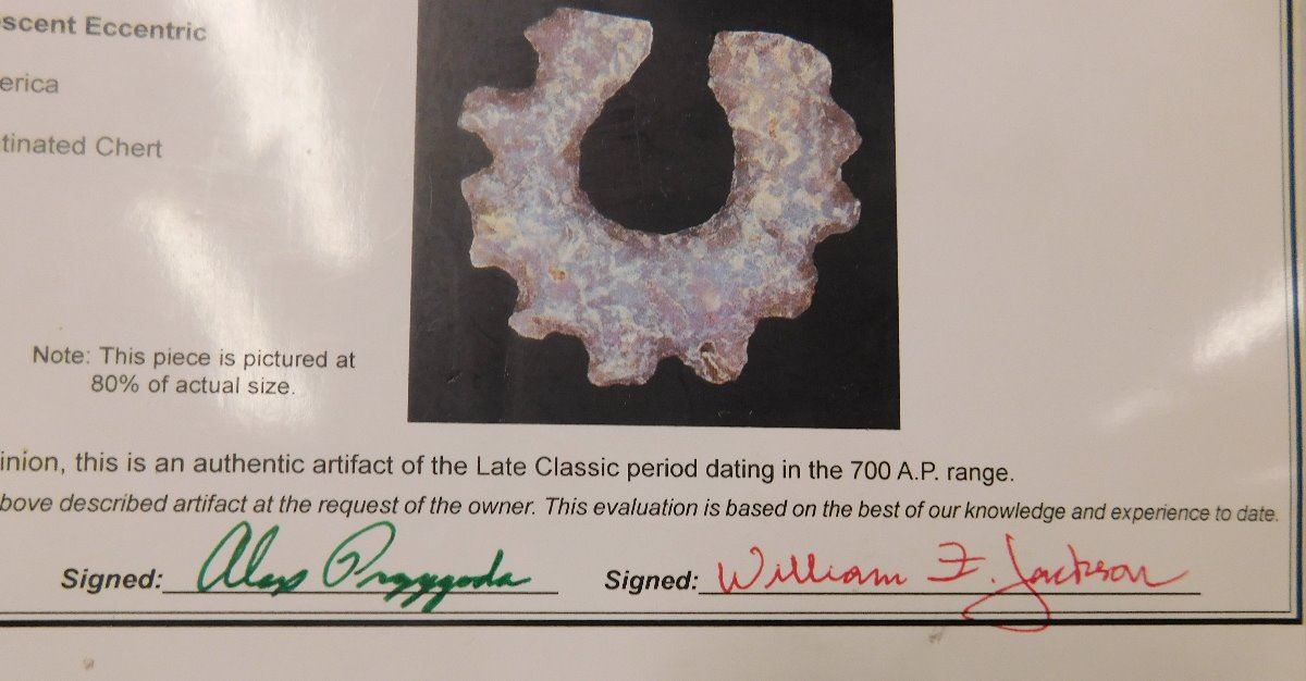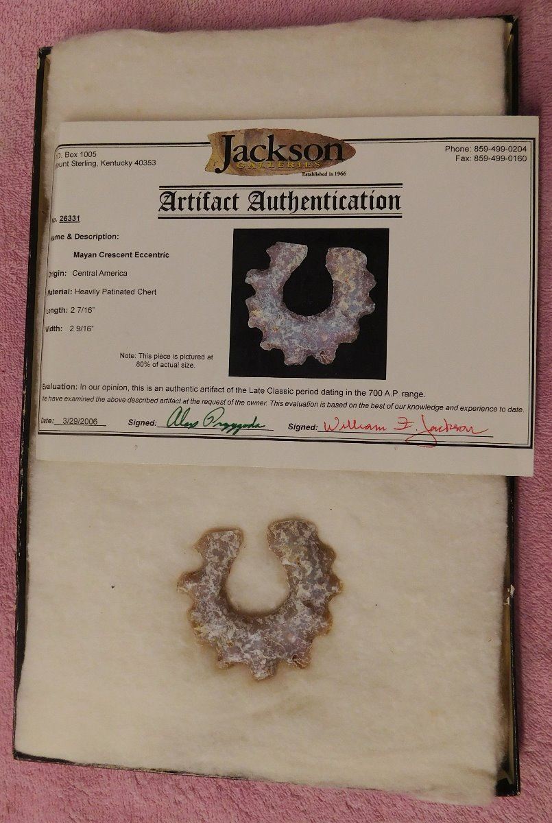 Mayan Eccentric, circa 1500 years old. Made of flint, the item measures 2 7/16" x 2 9/16". From Guatemala. Papered by Bill Jackson. Frame not included. Condition: Very nice, see images. Shipping: $24.00 w/insurance and signature.