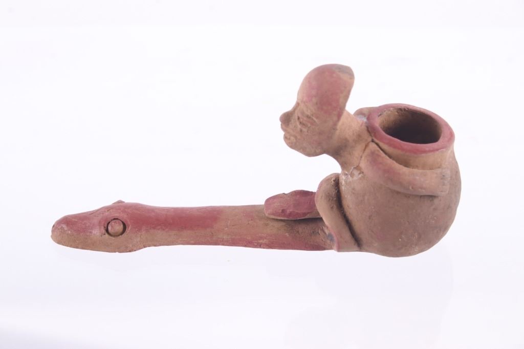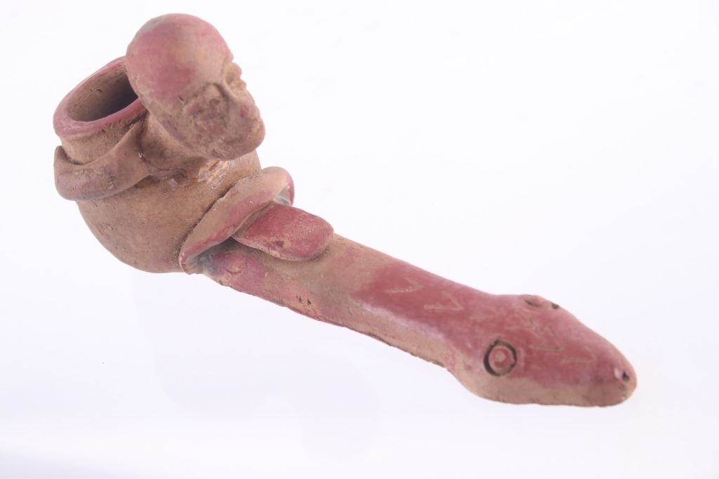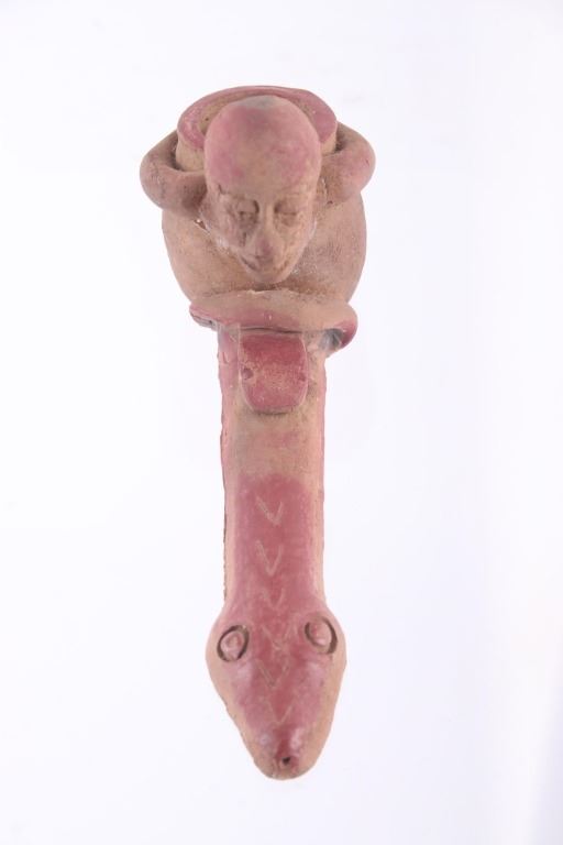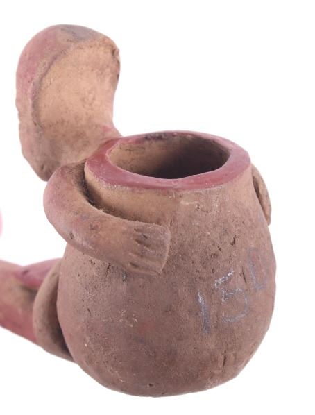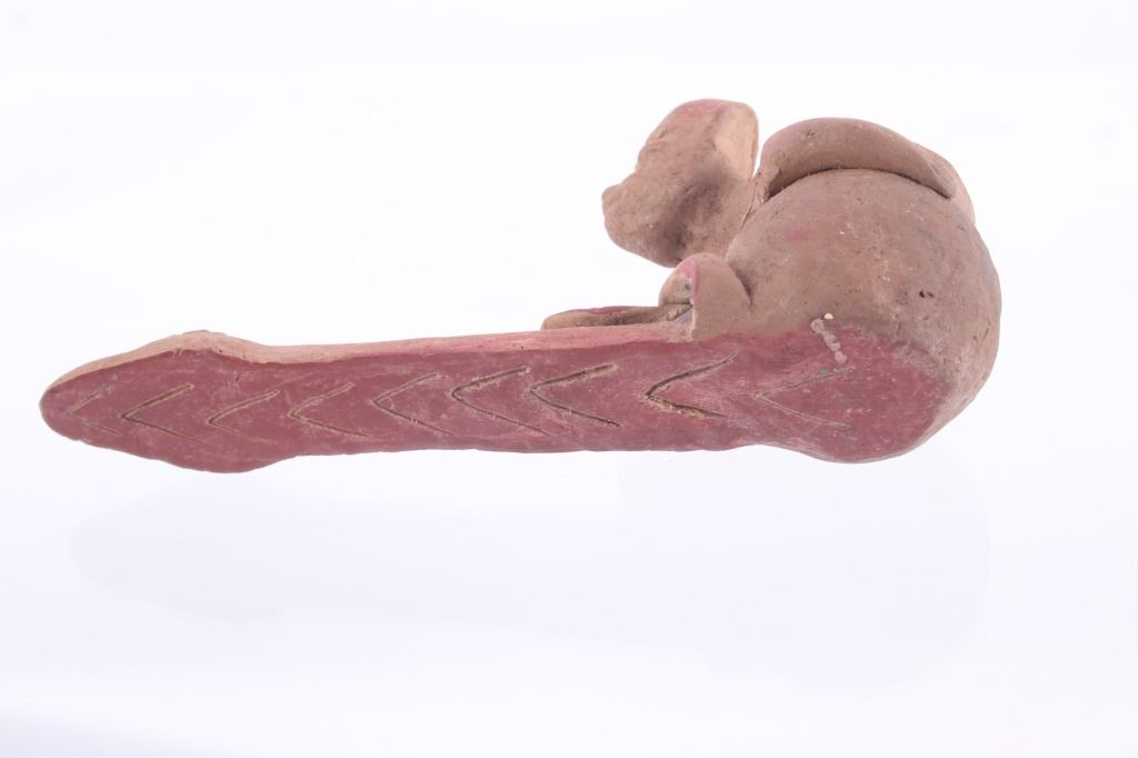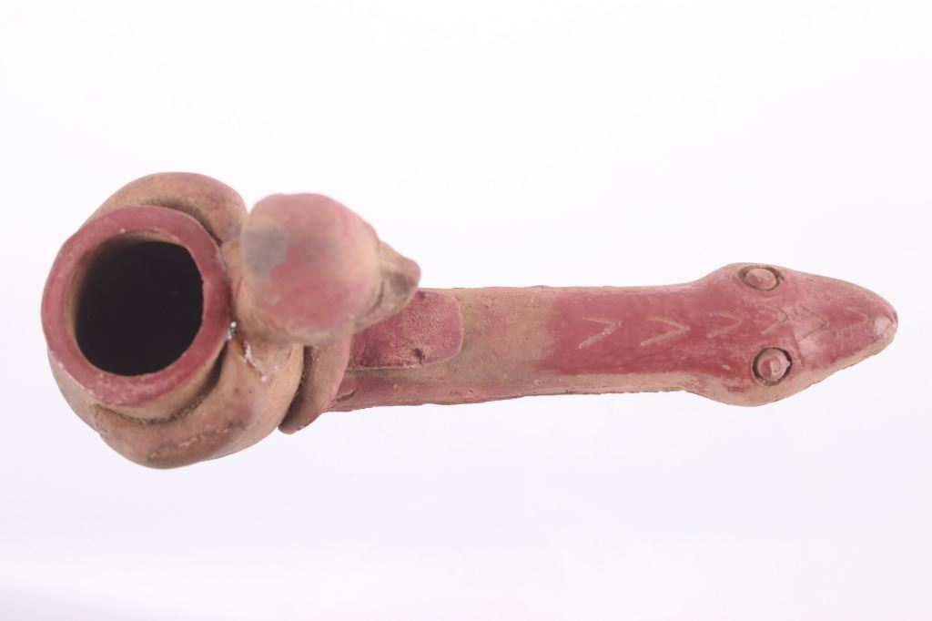 This is a rare circa 500 A.D. Mayan pottery pipe collected from Belize. The piece measures 5.5”L by 2.75”H and is made of baked terracotta clay. The figural smoking pipe features a shaman sitting with a long lizard protruding as the smoking tip, and underneath him is a South American venomous Fere-de-lance snake. The piece shows some repairs, but overall is truly fine example. There are still remnants of old red pigment paint on the pipe.
