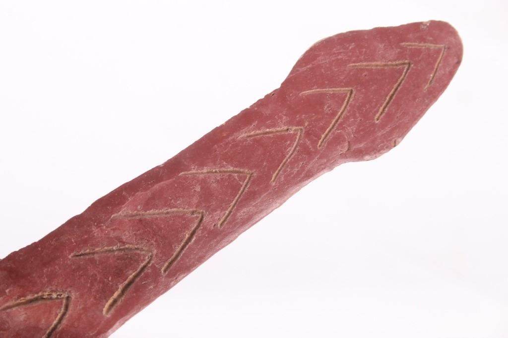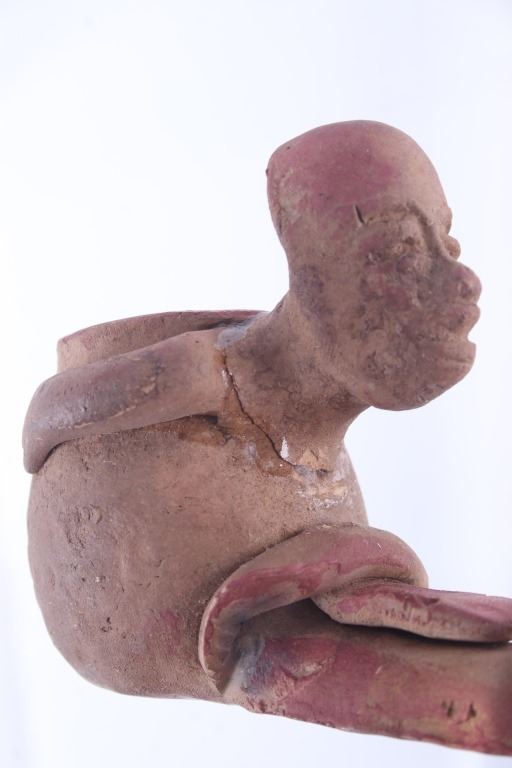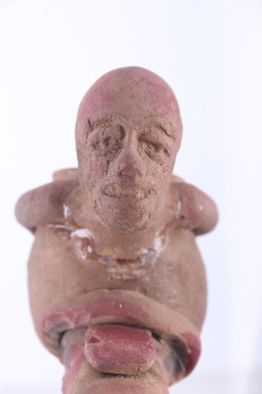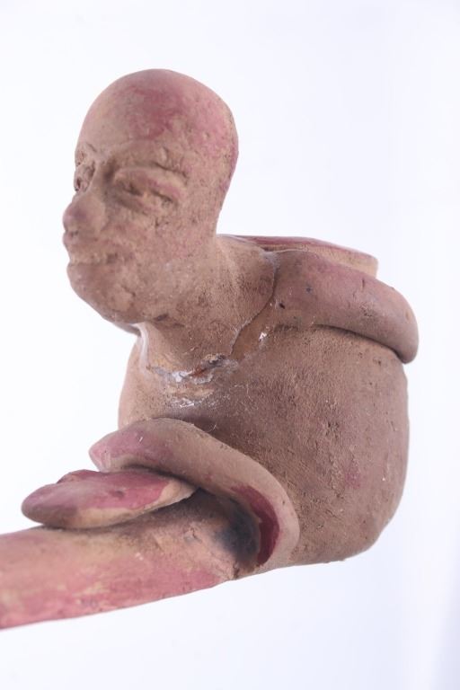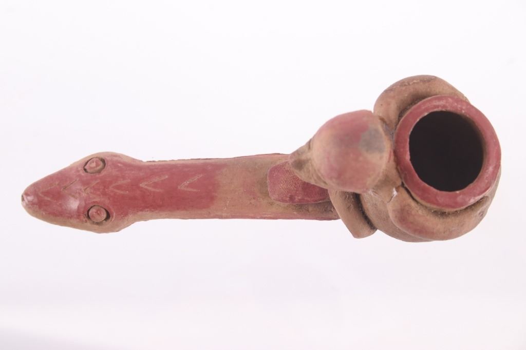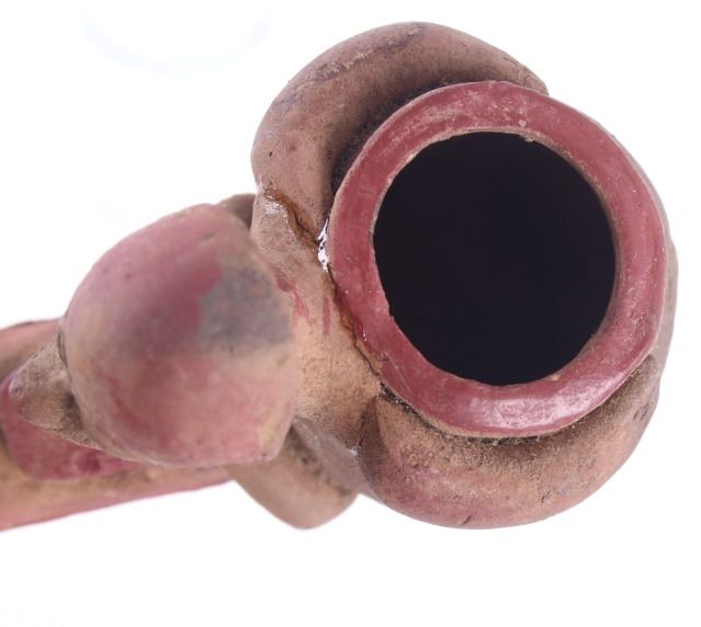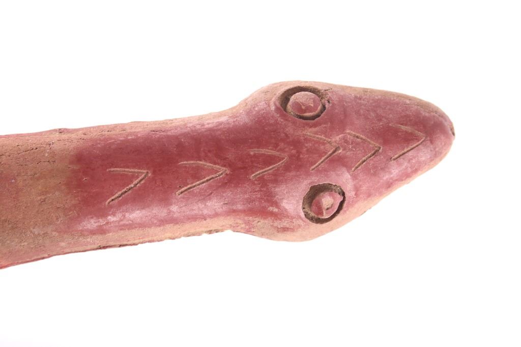 This is a rare circa 500 A.D. Mayan pottery pipe collected from Belize. The piece measures 5.5”L by 2.75”H and is made of baked terracotta clay. The figural smoking pipe features a shaman sitting with a long lizard protruding as the smoking tip, and underneath him is a South American venomous Fere-de-lance snake. The piece shows some repairs, but overall is truly fine example. There are still remnants of old red pigment paint on the pipe.