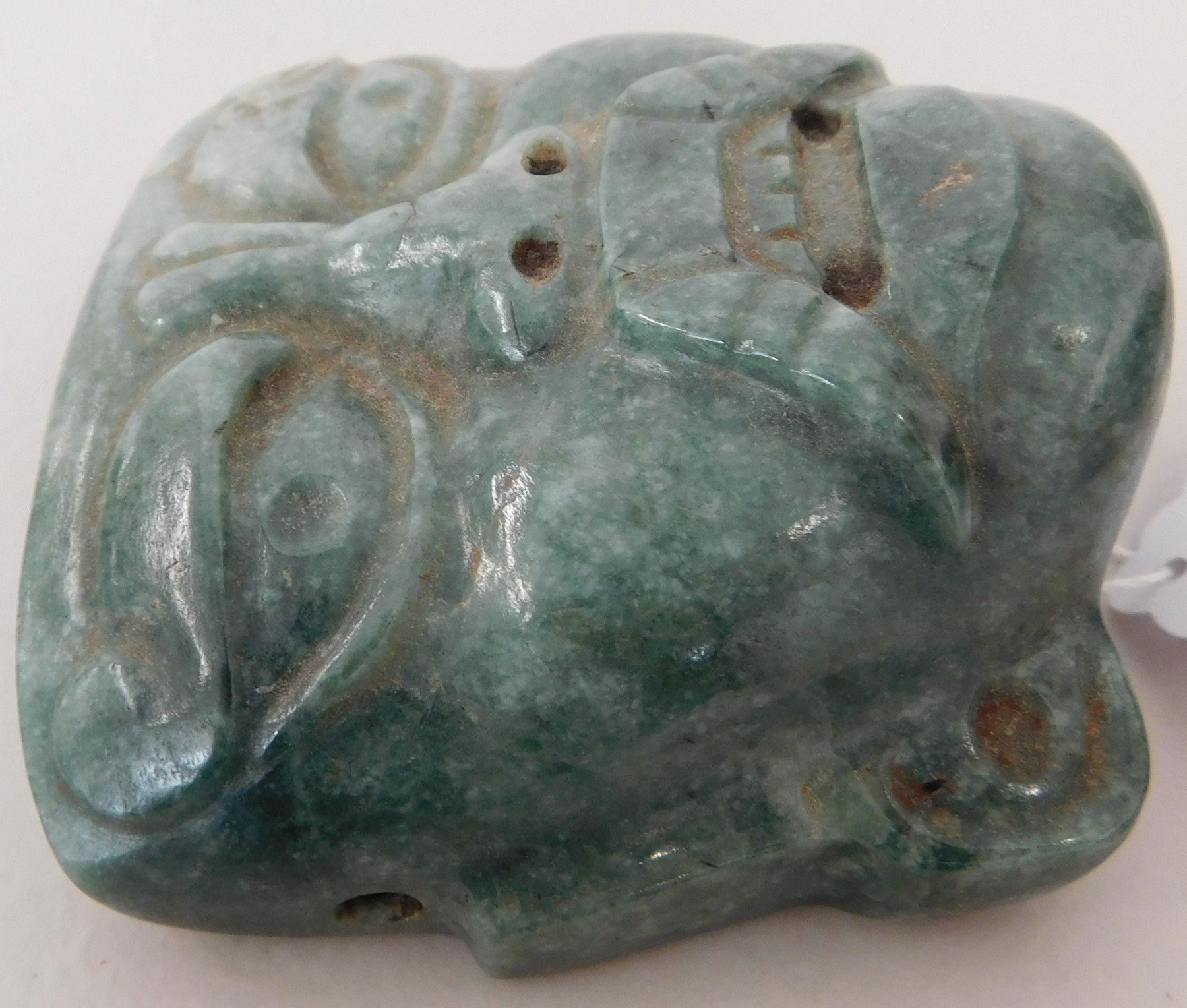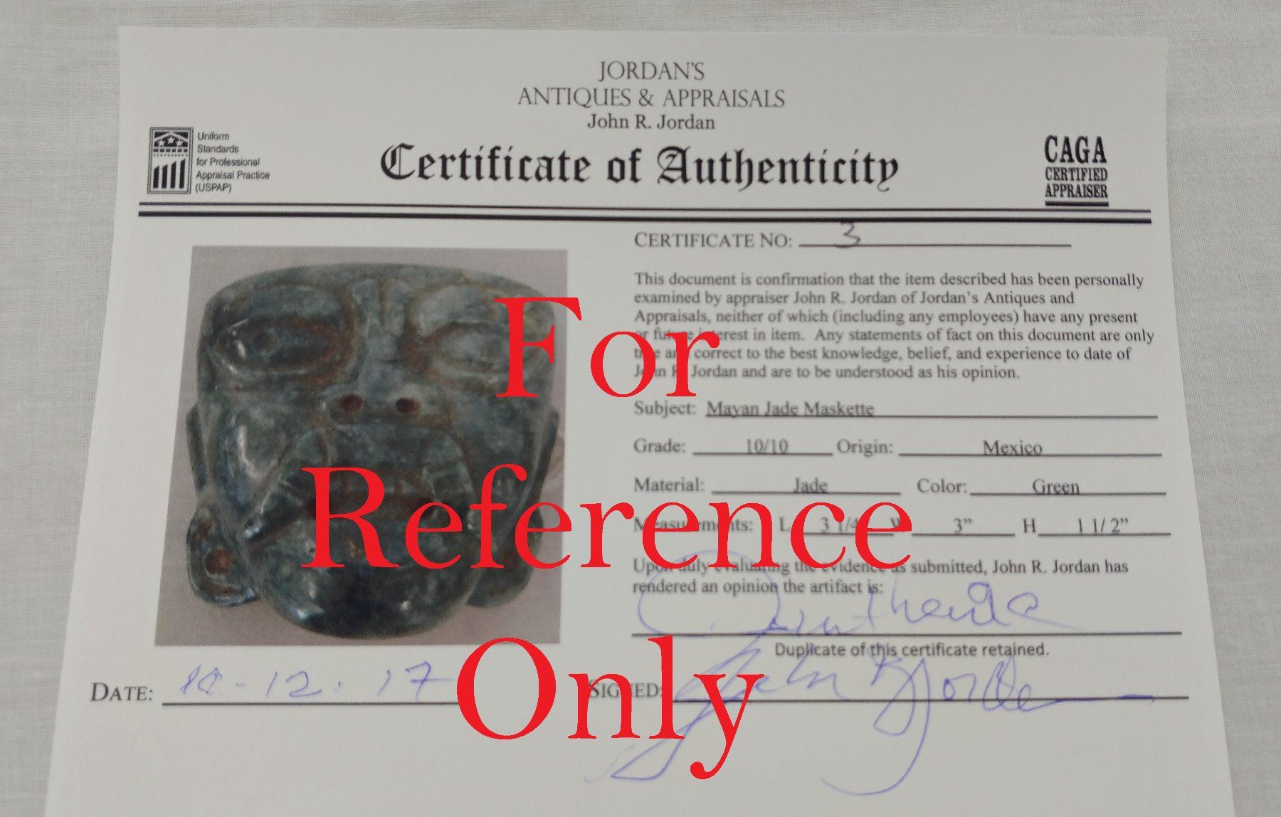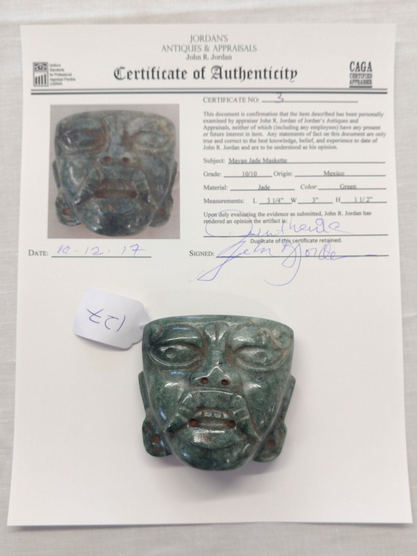Mayan Jade Maskette w/John Jordan COA, pre-Columbian item. Made of jade, the item measures 3 1/4" x 3" x 1 1/2". Mexico. From an old, 1960s California collection. John R. Jordan Certificate of Authenticity. Condition: Good, as found, see images. Shipping: $25.50 w/insurance and signature, due to value.