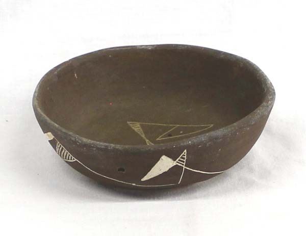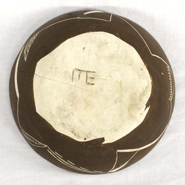 Mayan Style Carved Pottery Shallow Bowl, measures 1.5''H x 5''D, has initials ITE and pressure crack on the bottom, ''The ITE was the most important part of the Moche civilization. They made lots of pottery and artwork that set them apart from other civilizations.''