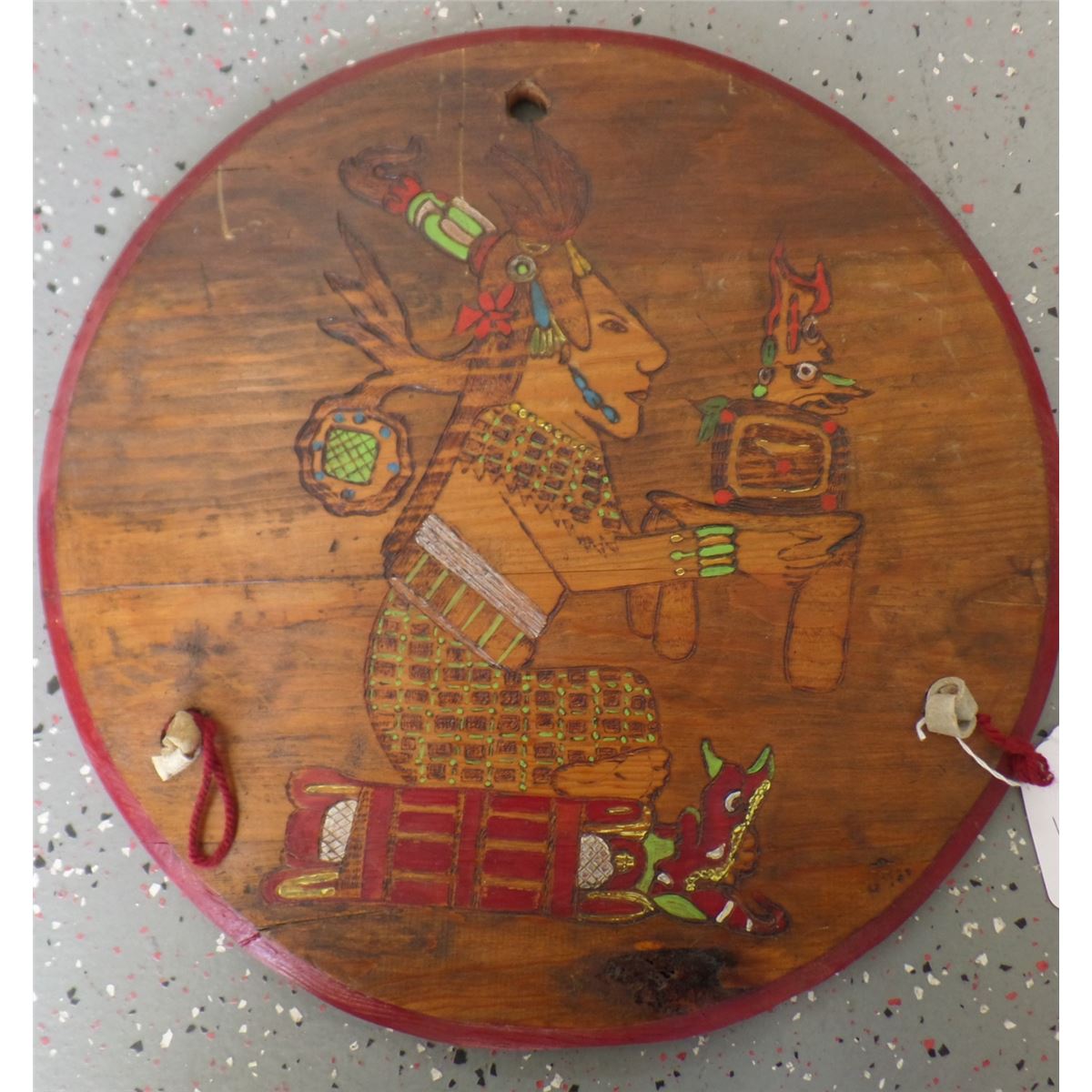 Mayan Style Wood Plaque, signed JM 89. This is an engraving of Mayan priest. It is made from wood, leather and paint and has minor nicks and scratches. Shipping $18.00