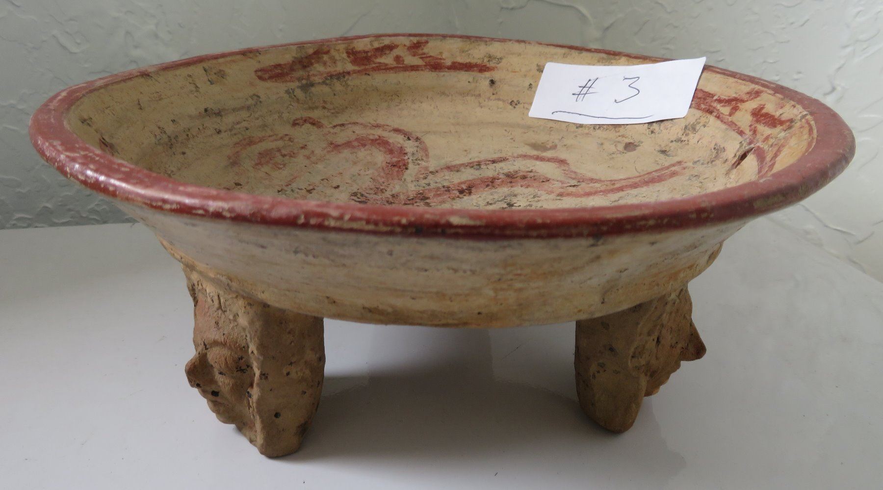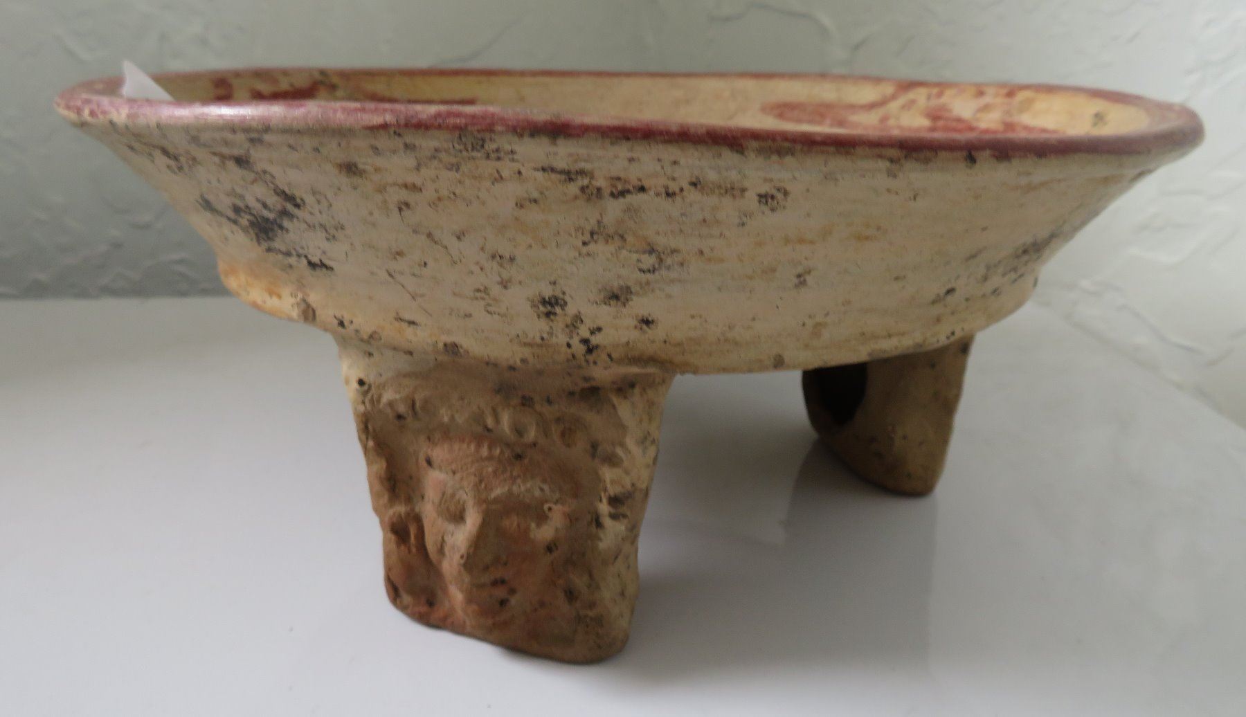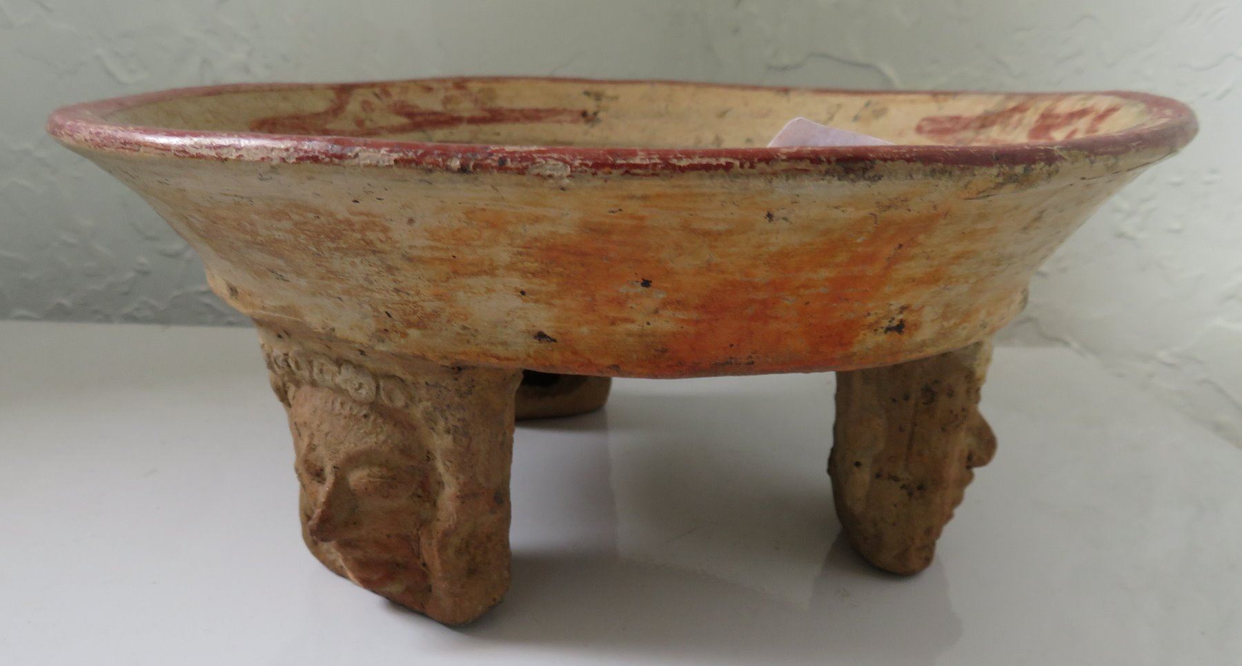 Mayan Tripod Effigy Bowl, pre-Columbian item. Made of clay, the item measures 8 3/4" x 3 1/2". Guatemala. Condition: Some paint loss, see images. Shipping: $30.00 w/insurance and signature, double-boxed.