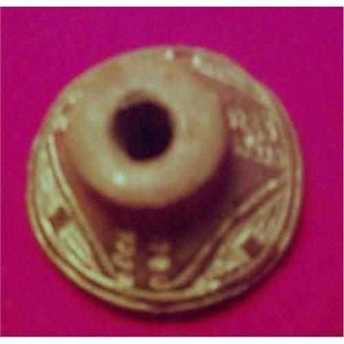 Mayan terracotta spindle whorl with intricate decorative design. Size: 1.25" diameter. In perfect condition. Estimated value: $400.
