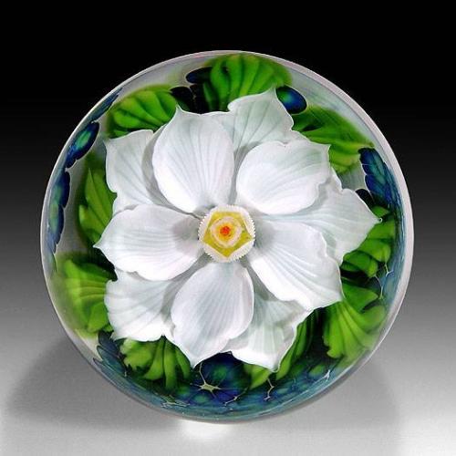 Mayauel Ward 2005 double-tiered white flower paperweight. The flower has an upright center section, with small petals and stamens, in orange, yellow, and white, which is surrounded by two open tiers of ridged white petals. Three clusters of green leaves surround the flower, over mottled aqua and off-white ground. Signed/dated. Diameter 3 3/8".