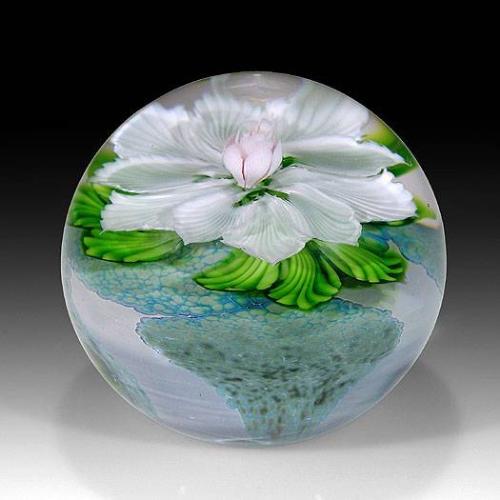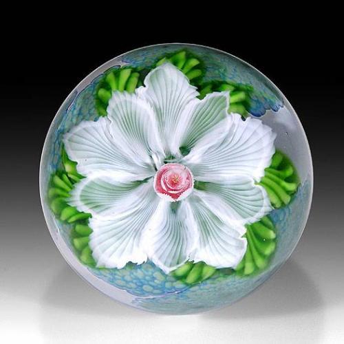 Mayauel Ward 2005 double-tiered white flower paperweight. The flower has an upright center section, with small petals and stamens, in orange, yellow, and white, which is surrounded by two open tiers of ridged white petals. Three clusters of green leaves surround the flower, over mottled aqua and off-white ground. Signed/dated 2005. Diameter 3 3/8".