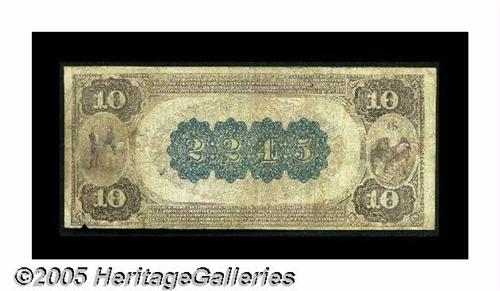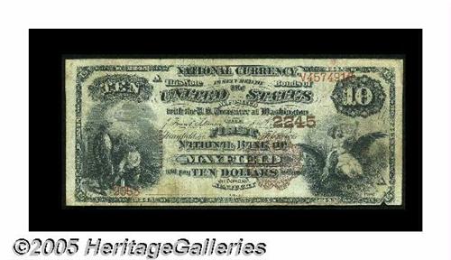<B>Mayfield, KY</B></I> - $10 1882 Brown Back Fr. 487 <B>The First NB of Mayfield</B></I> Ch. # 2245<BR>This <B>Fine</B></I> Kentucky Brown Back is an old friend, having passed through our May, 2002 Rosemont Signature Sale, where it sold for $517. A small notch in the lower margin is hardly worth mentioning. This is one of only four $10 Brown Backs known to have survived from here, so don't be timid in bidding for this scarce note. We expect that the price paid nearly three years ago will be handily topped tonight.