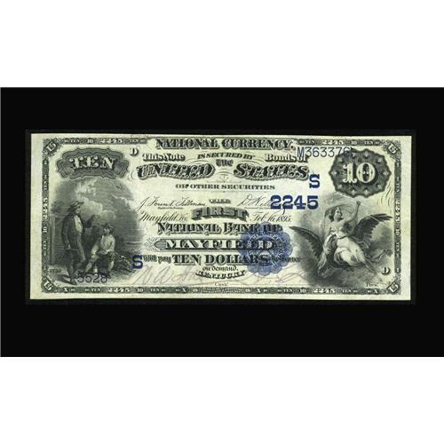 <B>Mayfield, KY</B></I> - $10 1882 Date Back Fr. 542 <B>The First NB</B></I> Ch. # (S)2245<BR>A scarcer early note from the first of three banks chartered here. Pleasing <B>Very Fine.</B></I>