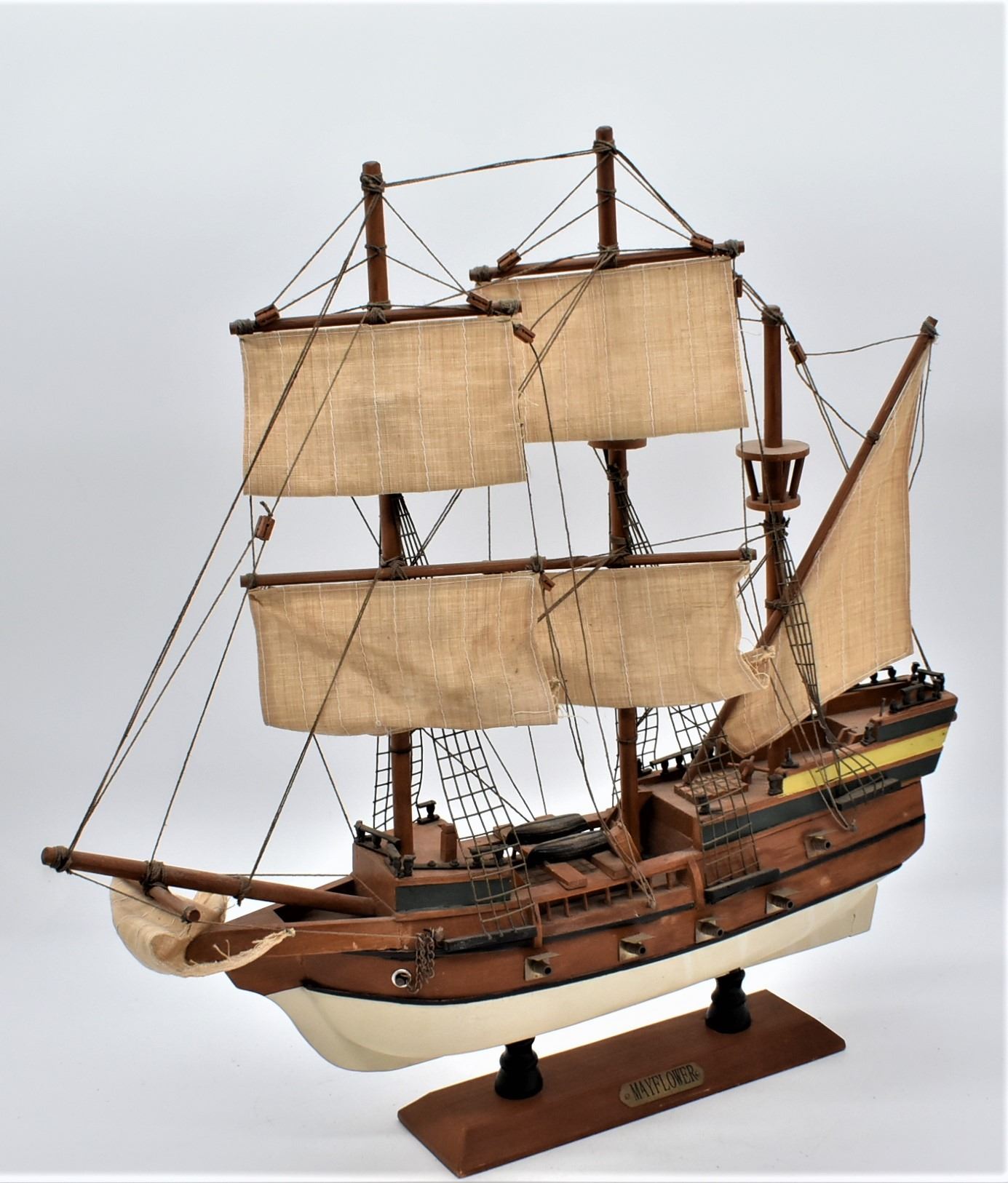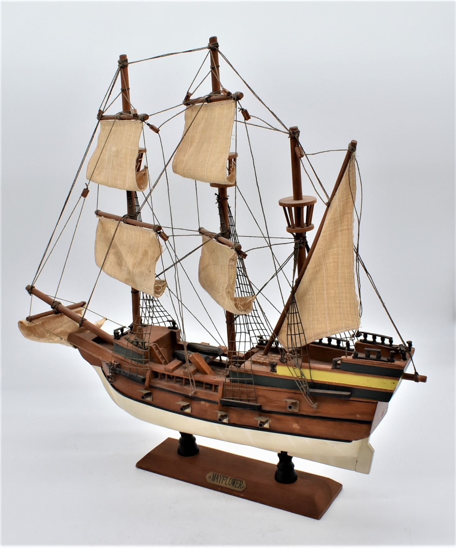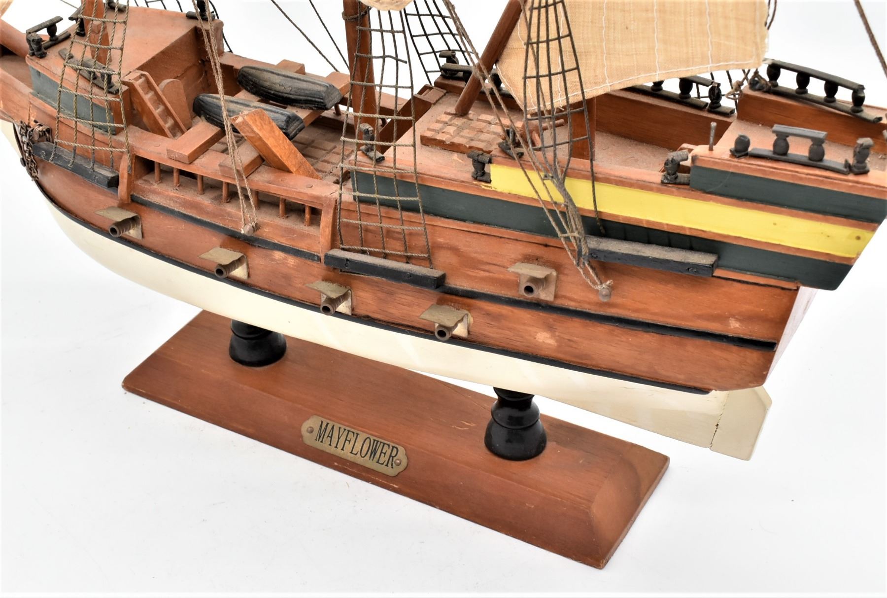 Mayflower Hand Crafted Sailing Ship Replica, measures 19''L x 17.5'' x 4.5''W, comes with brass nameplate, some missing railing and one of the shrouds is loose