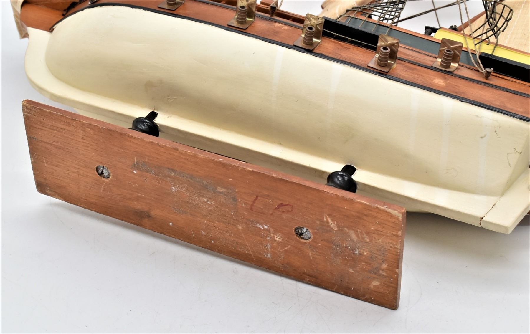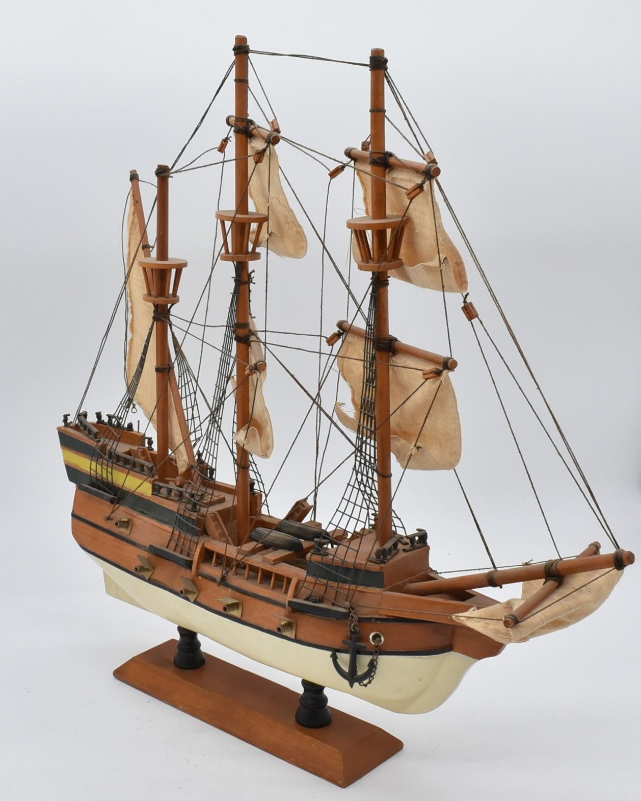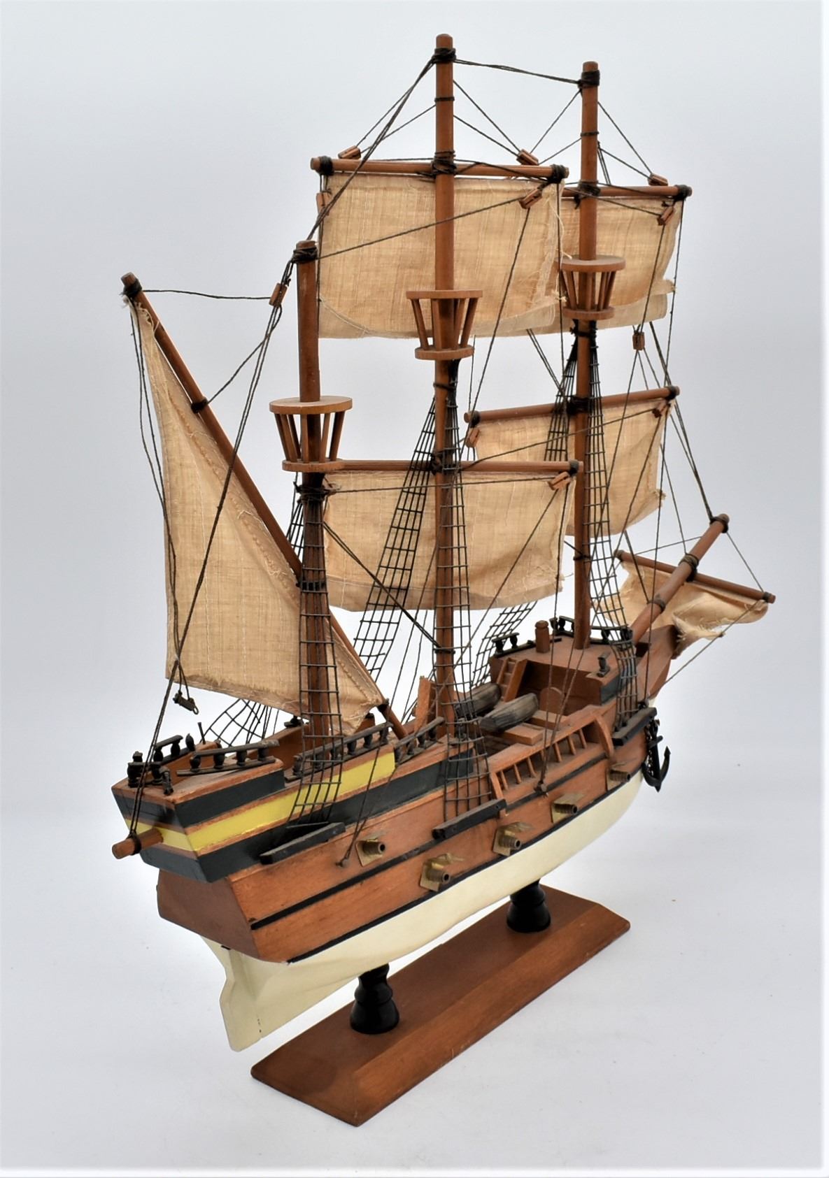 Mayflower Hand Crafted Sailing Ship Replica, measures 19''L x 17.5'' x 4.5''W, comes with brass nameplate, some missing railing and one of the shrouds is loose