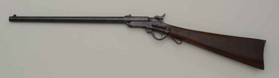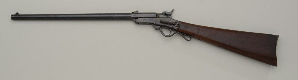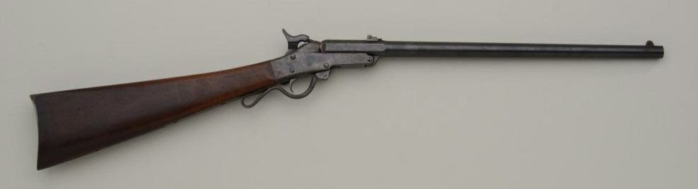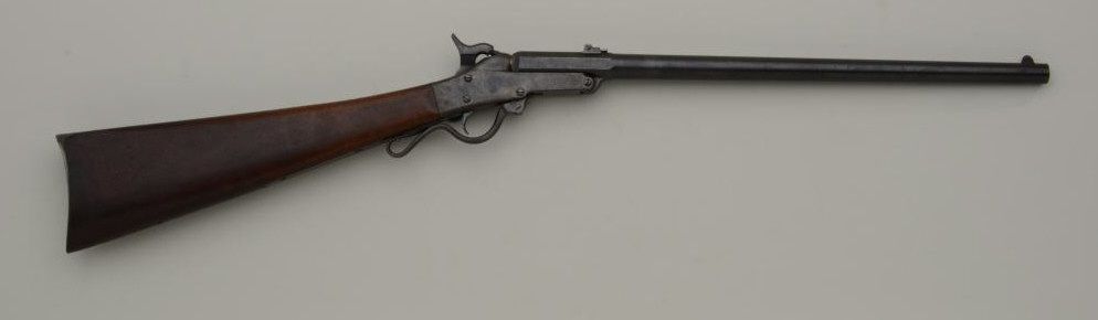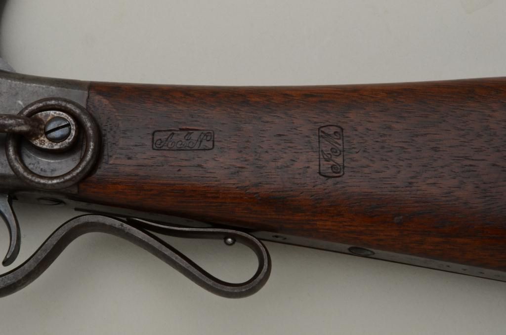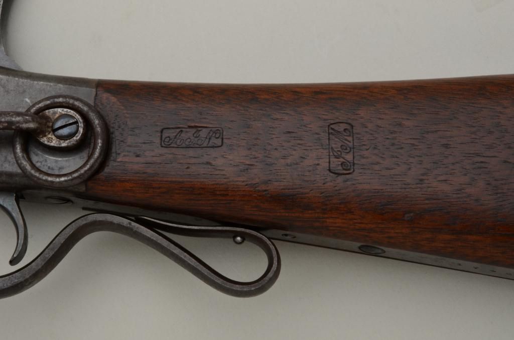 Maynard 2nd model .50 caliber percussion breech loading carbine in very good plus to near fine original condition serial number 17428. The barrel retains 75% to 85% original blue which is toning and dulling slightlywith some slight to moderate erosion and pinprick pitting just starting in a few small areas near the breech and on the sides of barrel. The frame shows 40% to 60% case hardening that is muting and drifting to apatina with some light colors still visible. The markings are sharp on the left side of breech. The stock is very good plus to near fine with couple minor dents, bruises with two razor-sharp cartouches. The butt plateshows a dark patina with some light to moderate pitting. The small parts are all retained including sights. The bore is bright and near new. A strong 8 on 1 to 10 scale. Est.: $1,100-$2,200.
