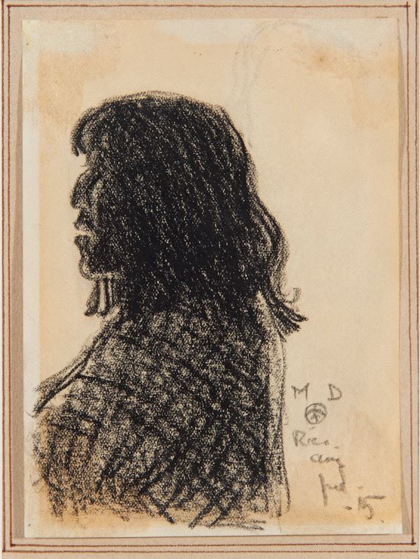 This drawing is in good condition. With the unaided eye, there are visible marks where a smaller window mat was previously used. There is yellowing of the paper. The work is mounted under plexiglass and has not been inspected out of the frame. The frame is an extruded black aluminum with a beige French lined float mat. The frame is in very good condition with normal wear. Verso: label: Benson Fine Art, Ruidoso, New Mexico, listing artist, title, signature information and dimensions. Attached copy: photocopy of a page from -Portraits of the Southwest" Apache Head, 1915, no. 36, showing a similar profile drawing. Inscribed: UV Plexi Cons Board 4/4/92.