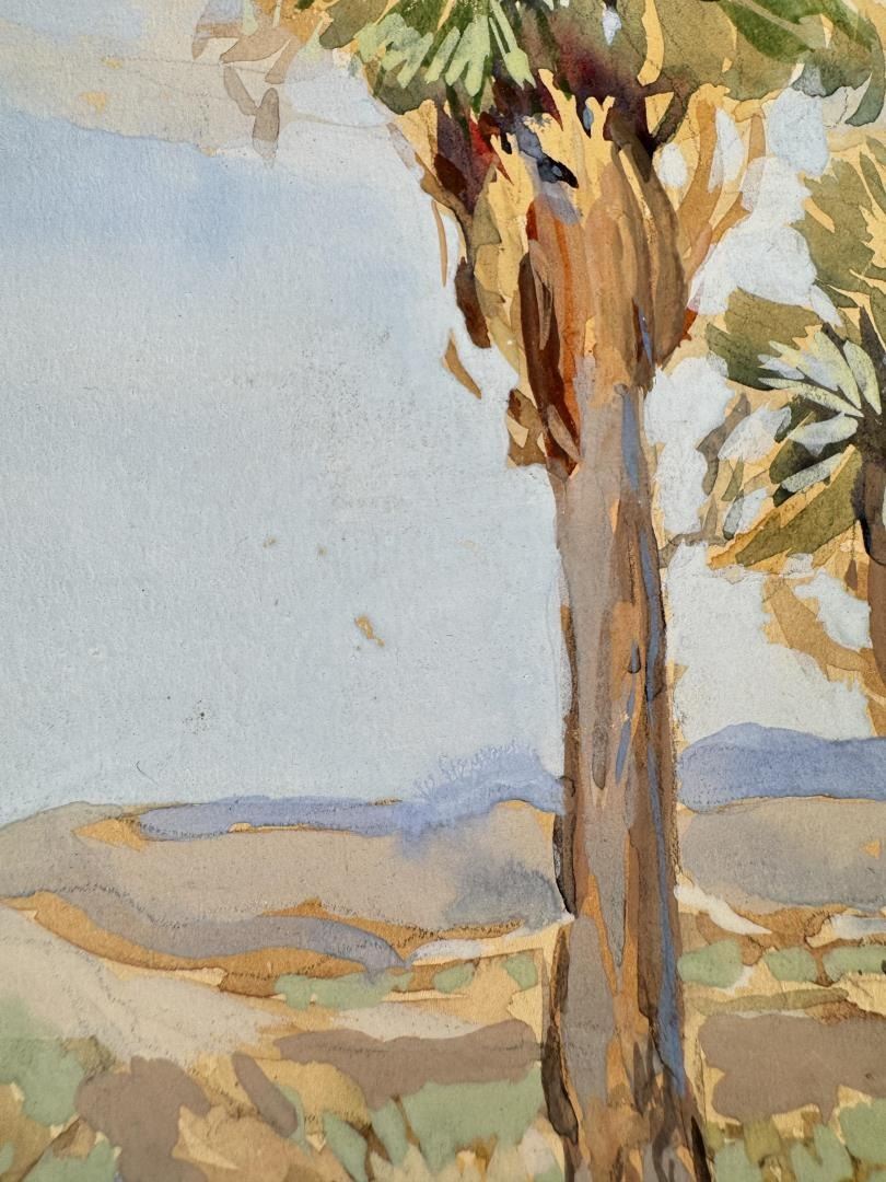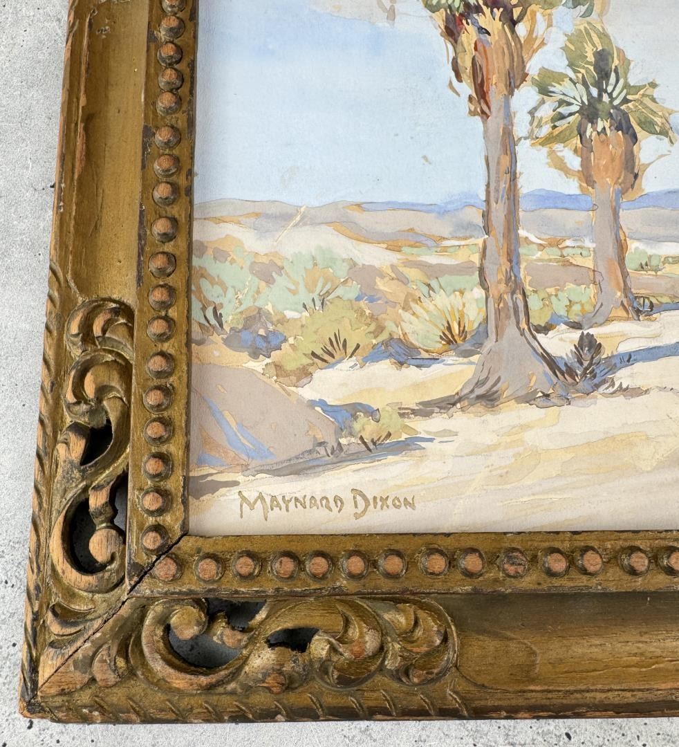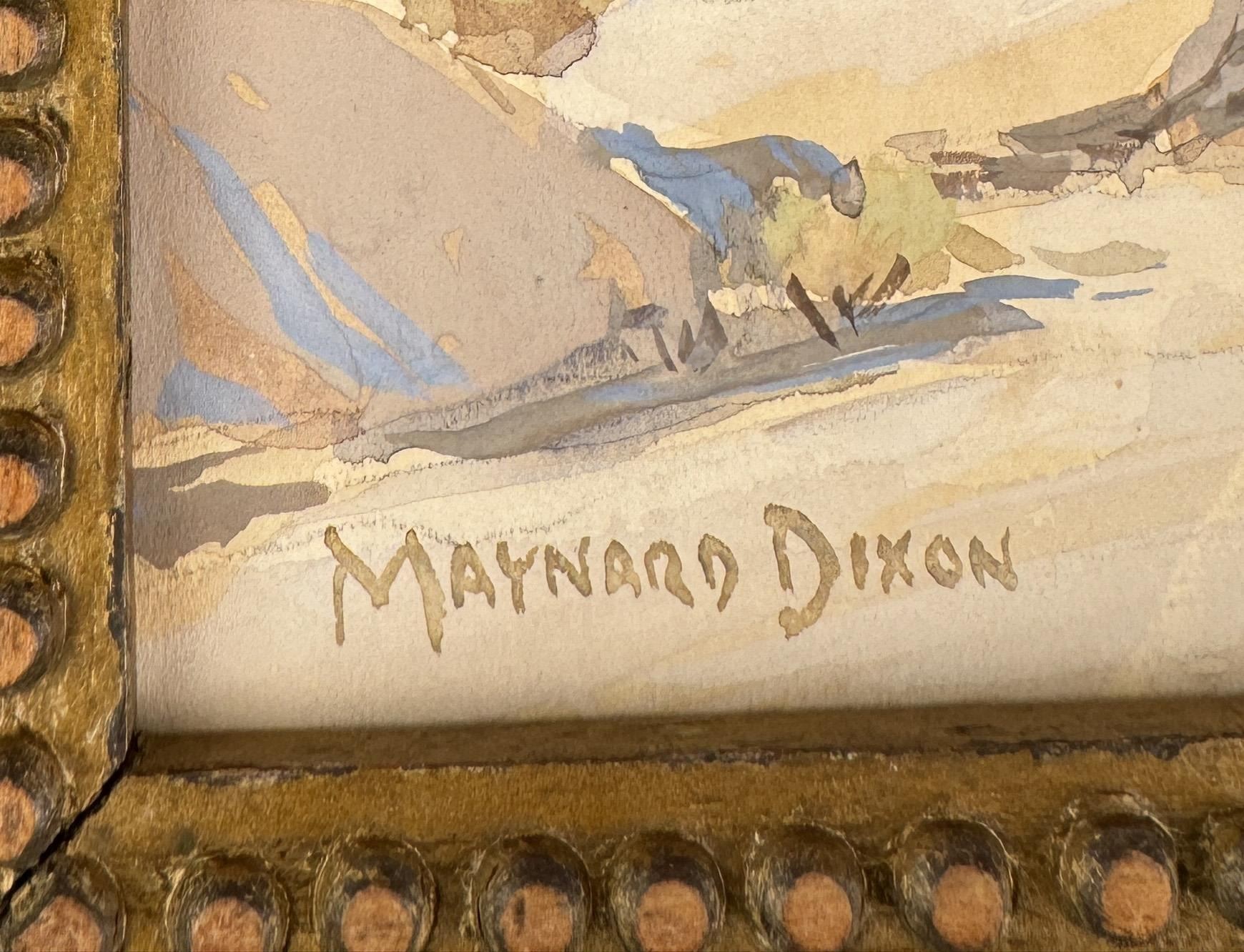 Title is Palm Desert. 9" by 13" unframed, 13 1/2" by 16" framed. Provenance: From the Estate of Uvaldo and Isabel Sandoval of Taos New Mexico. Uvaldo was the sheriff of Taos Pueblo from 1952-1954. Condition: A few small abrasions as shown. Maynard Dixon (1875 - 1946) was active/lived in California, Arizona. Maynard Dixon is known for Western landscape painting-skyscapes, Indians. Born in Fresno, CA on Jan. 24, 1875. A sickly child, sketching occupied a lot of Dixon's time while growing up. As a boy he listened with fascination to the stories of the Old West told by the old timers. It is no wonder that cowboys and Indians were to become the main subject matter of his life's work. At 16 he sent his sketch book to Frederic Remington who encouraged him to pursue an art career. The Dixon family moved to Alameda, CA in 1893, the year the artist's first illustration was published in Overland Monthly. Dixon enrolled at the Mark Hopkins Art Institute, but the confines of a classroom were not to his liking and he remained only three months. In 1895 he took his first full-time job as an illustrator for the San Francisco Morning Call and continued four years later with the Examiner. By 1899 he was making regular sketching trips into the Northwest and Southwest, during which time he was exhibiting regularly with the San Francisco Art Ass'n. In 1905 he married artist Lillian West Tobey. A year later the earthquake and fire destroyed his studio and most of his early works. The Dixons then lived across the Golden Gate in Sausalito until 1907 when he accepted a commission from the Southern Pacific Railroad to paint a mural for their depot in Tucson, AZ. Afterwards he moved to New York where he continued his magazine illustrations. Upon returning to California in 1912, he abandoned commercial art to concentrate on easel paintings and murals. During the PPIE of 1915 he suffered a nervous breakdown and divorced his wife in 1917. He married photographer Dorothea Lange in 1920. This marriage lasted until 1935 and in 1937 he married artist Edith Hamlin. During the 1930s he did murals and paintings for the WPA. In 1938 ill health forced his move to the drier climate of Tucson, AZ where he spent his last years while maintaining a studio nearby in Mt Carmel, UT. Dixon died in Tucson on Nov. 14, 1946. Today he is internationally famous for his western subjects which he often signed with his logo, an Indian Thunderbird.