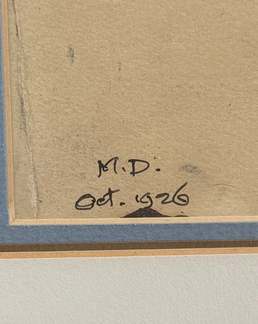 Title is Mexican Girl (Oct. 1926). 8" by 10 1/2" unframed, 16 5/8" by 20 1/2" framed. Charcoal on paper. Provenance: Coeur d’Alene Art Auction 07/21/2012 Lot 243, The Artist, gifted to Joe Coppa, San Francisco, California Present owner, by descent Maynard Dixon (1875 - 1946) was active/lived in California, Arizona. Maynard Dixon is known for Western landscape painting-skyscapes, Indians. Born in Fresno, CA on Jan. 24, 1875. A sickly child, sketching occupied a lot of Dixon's time while growing up. As a boy he listened with fascination to the stories of the Old West told by the old timers. It is no wonder that cowboys and Indians were to become the main subject matter of his life's work. At 16 he sent his sketch book to Frederic Remington who encouraged him to pursue an art career. The Dixon family moved to Alameda, CA in 1893, the year the artist's first illustration was published in Overland Monthly. Dixon enrolled at the Mark Hopkins Art Institute, but the confines of a classroom were not to his liking and he remained only three months. In 1895 he took his first full-time job as an illustrator for the San Francisco Morning Call and continued four years later with the Examiner. By 1899 he was making regular sketching trips into the Northwest and Southwest, during which time he was exhibiting regularly with the San Francisco Art Ass'n. In 1905 he married artist Lillian West Tobey. A year later the earthquake and fire destroyed his studio and most of his early works. The Dixons then lived across the Golden Gate in Sausalito until 1907 when he accepted a commission from the Southern Pacific Railroad to paint a mural for their depot in Tucson, AZ. Afterwards he moved to New York where he continued his magazine illustrations. Upon returning to California in 1912, he abandoned commercial art to concentrate on easel paintings and murals. During the PPIE of 1915 he suffered a nervous breakdown and divorced his wife in 1917. He married photographer Dorothea Lange in 1920. This marriage lasted until 1935 and in 1937 he married artist Edith Hamlin. During the 1930s he did murals and paintings for the WPA. In 1938 ill health forced his move to the drier climate of Tucson, AZ where he spent his last years while maintaining a studio nearby in Mt Carmel, UT. Dixon died in Tucson on Nov. 14, 1946. Today he is internationally famous for his western subjects which he often signed with his logo, an Indian Thunderbird.