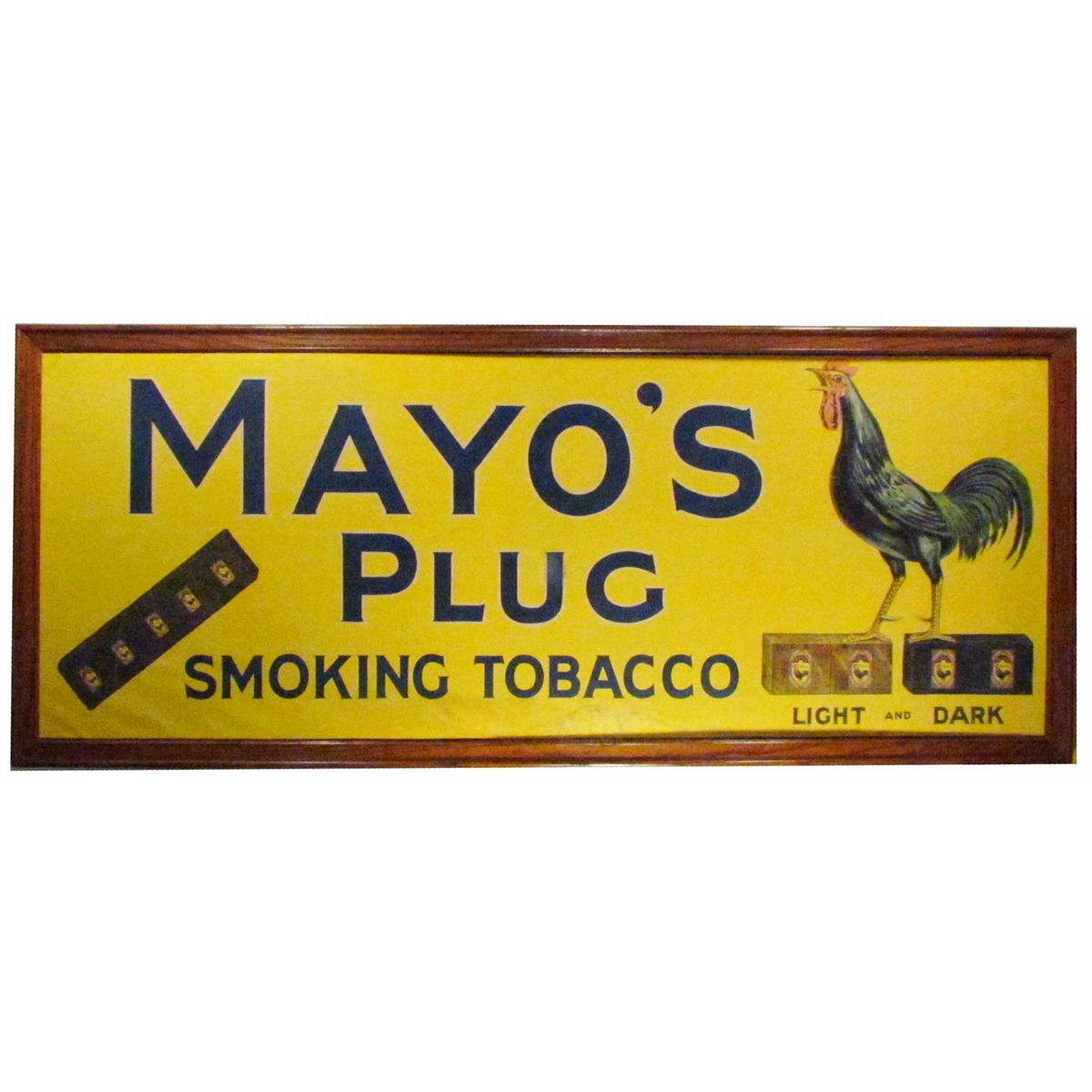 Mayo's Plug Smoking Tobacco Linen Sign. Mounted on board, some light staining across bottom otherwise very good condition. 61 X 25 inches overall.