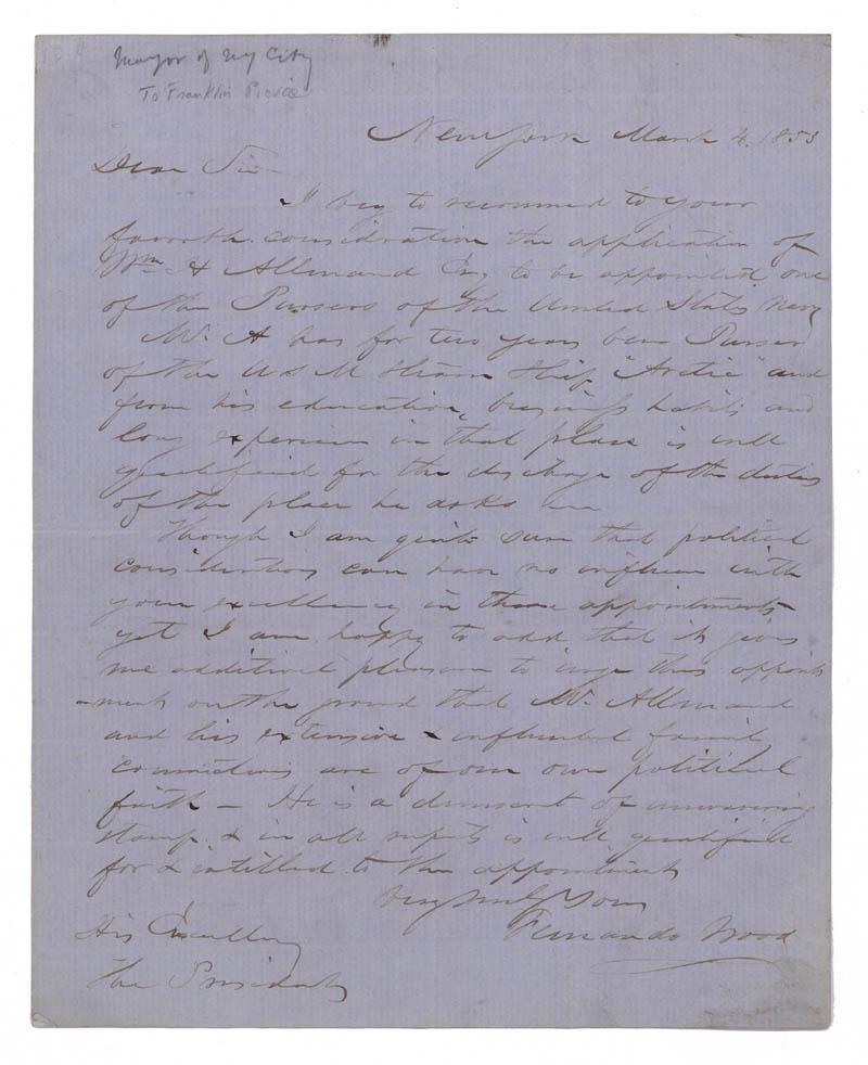 FERNANDO WOOD (1812-1881). Congressman, Mayor of New York City. Autograph Letter Signed “Fernando Wood.” 1 page, New York, 1853. Mayor Wood writes to Franklin Pierce ,“His Excellency” with some insightful political content into the political appointment process: “…I beg to recommend to your favorable consideration the application of Wm. H. Allmand, Eng. To be appointed one of the Pursers of the United States Navy…Though I am quite sure that political consideration can have no influence with your excellency in that appointment, yet I am happy to add…his extensive influential family connections are of our own political faith – He is a democrat of unwavering stomp….” Includes a 19th century steel plate engraving of Wood. Light age wear, mostly Fine.