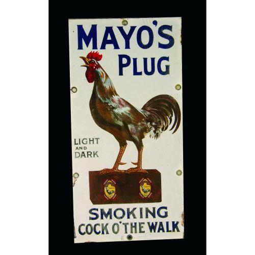 Mayos Plug Smoking Tobacco Porcelain Sign. Some minor edge ware and fading otherwise very good condition. 6 1/2 X 13 inches.