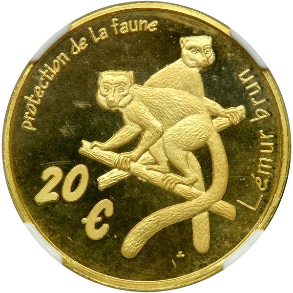 Mayotte. Essai 20 Euro, 2004. KM-#XE15. Brown Lemura. With certificate. Only 300 struck of this one year type. Scarce. NGC graded Proof 67 Ultra Cameo.