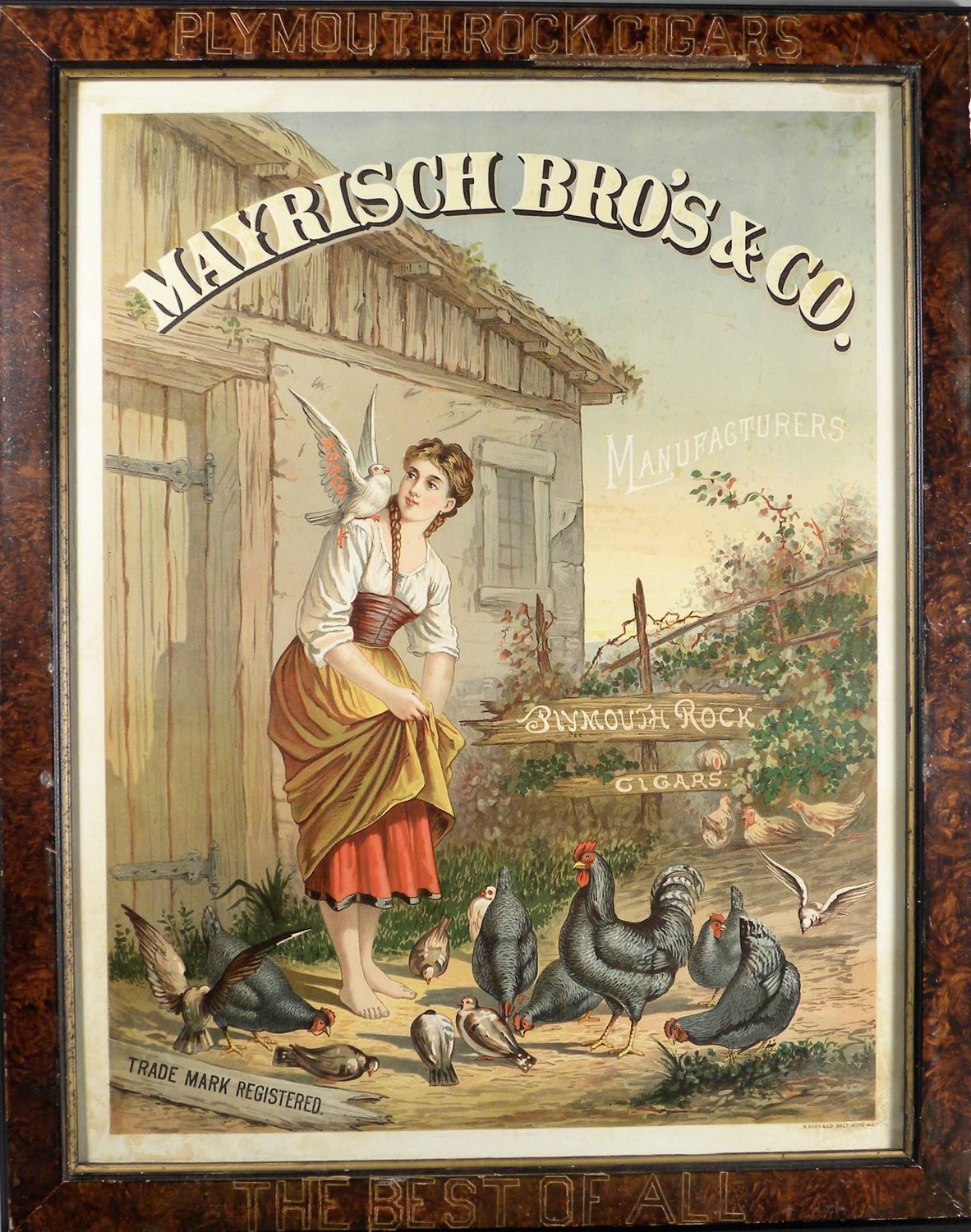 Mayrisch Bro's & Co. Cigars Paper Sign. Plymouth Rock Cigars the best of all on the original frame. 25 X 31 inches overall.