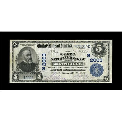 <B>Maysville, KY</B></I> - $5 1902 Plain Back Fr. 598 <B>The State NB</B></I> Ch. # (S)2663<BR>We've sold this note twice before. First, at our 2002 Florida United Numismatists Signature Sale, where it went for $230. It was next on the market in our 2004 Milwaukee Central States Numismatic Society auction, where it sold for $540. We expect a result more consistent with the higher realization tonight, perhaps even somewhat stronger. <B>Very Fine.</B></I><BR><BR><b>Shipping:</b> Coin/Currency (<a target="_blank" href="http://www.heritageauctions.com/common/shipping.php">view shipping information</a>)