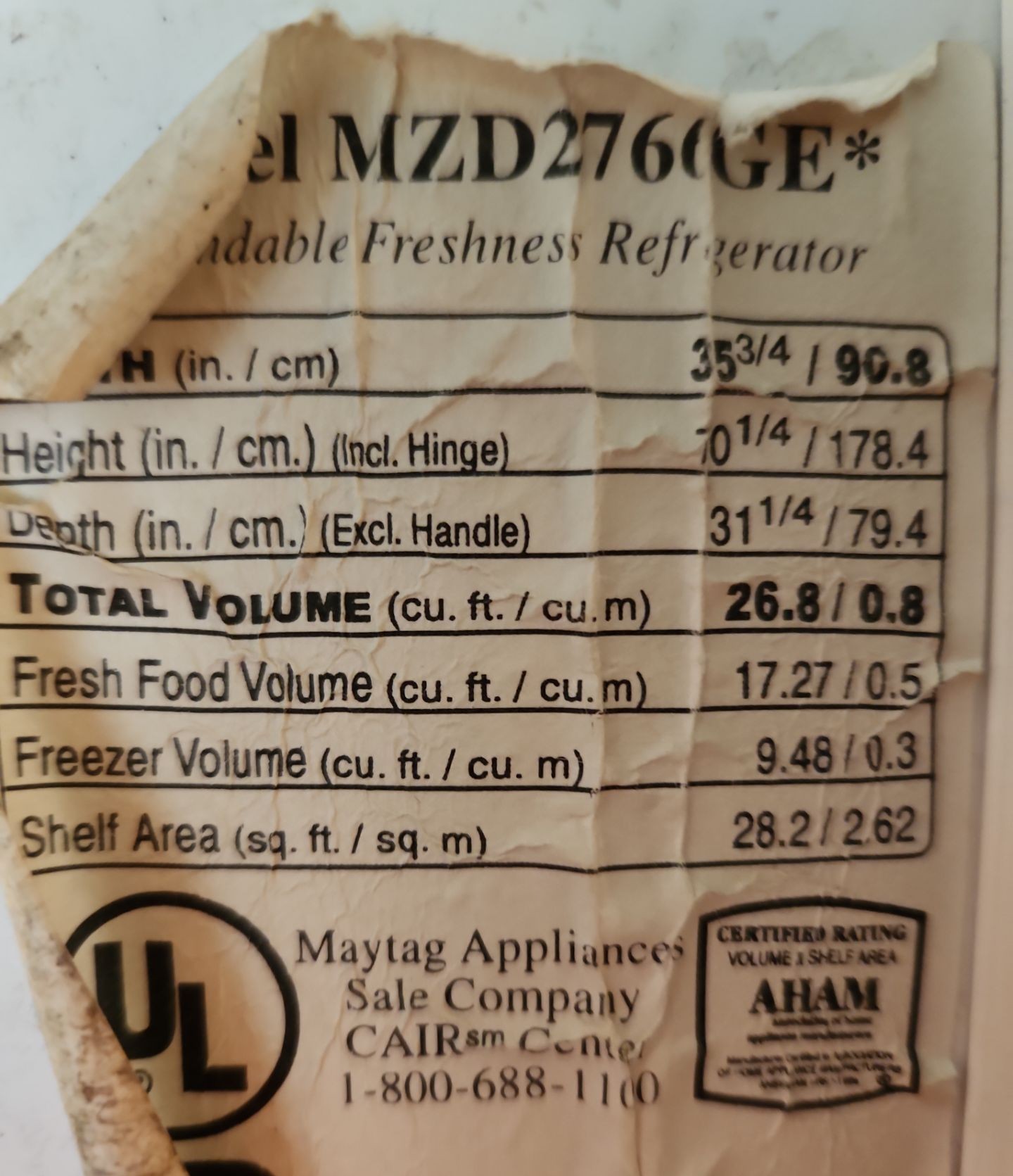 Maytag Plus Fridge Model MZD2760GE w/ Water and Ice Dispenser, Bring Assistance To Move