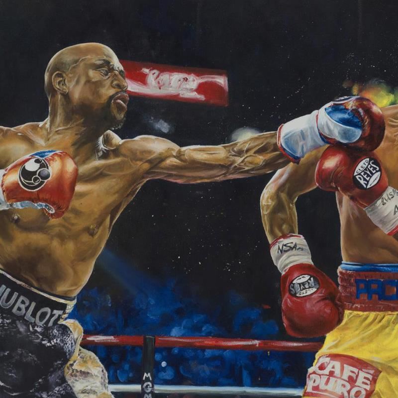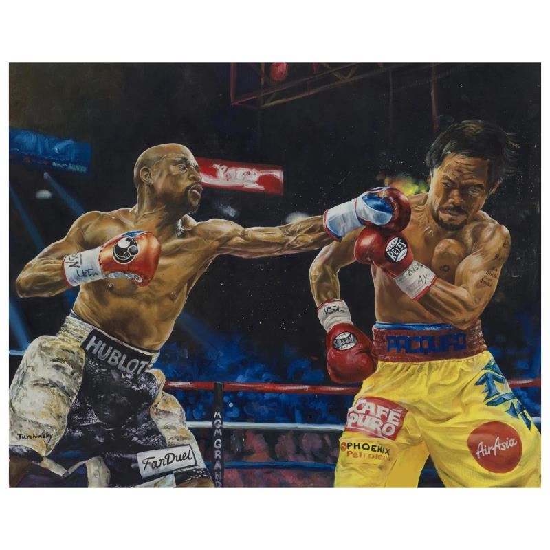 "Mayweather Vs Pacquiao" is a limited edition Mixed Media on Canvas by Turchinsky Dimitry. The piece is numbered, hand siged by the artist, and come with a letter of authenticity. Measures approximately 24" x 30".