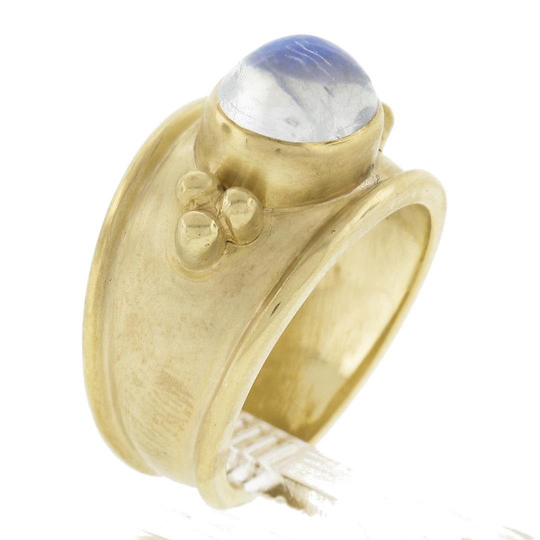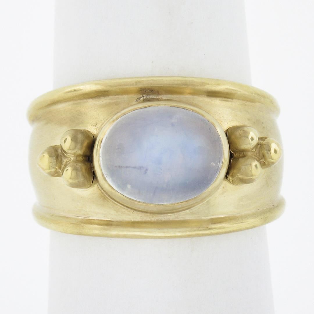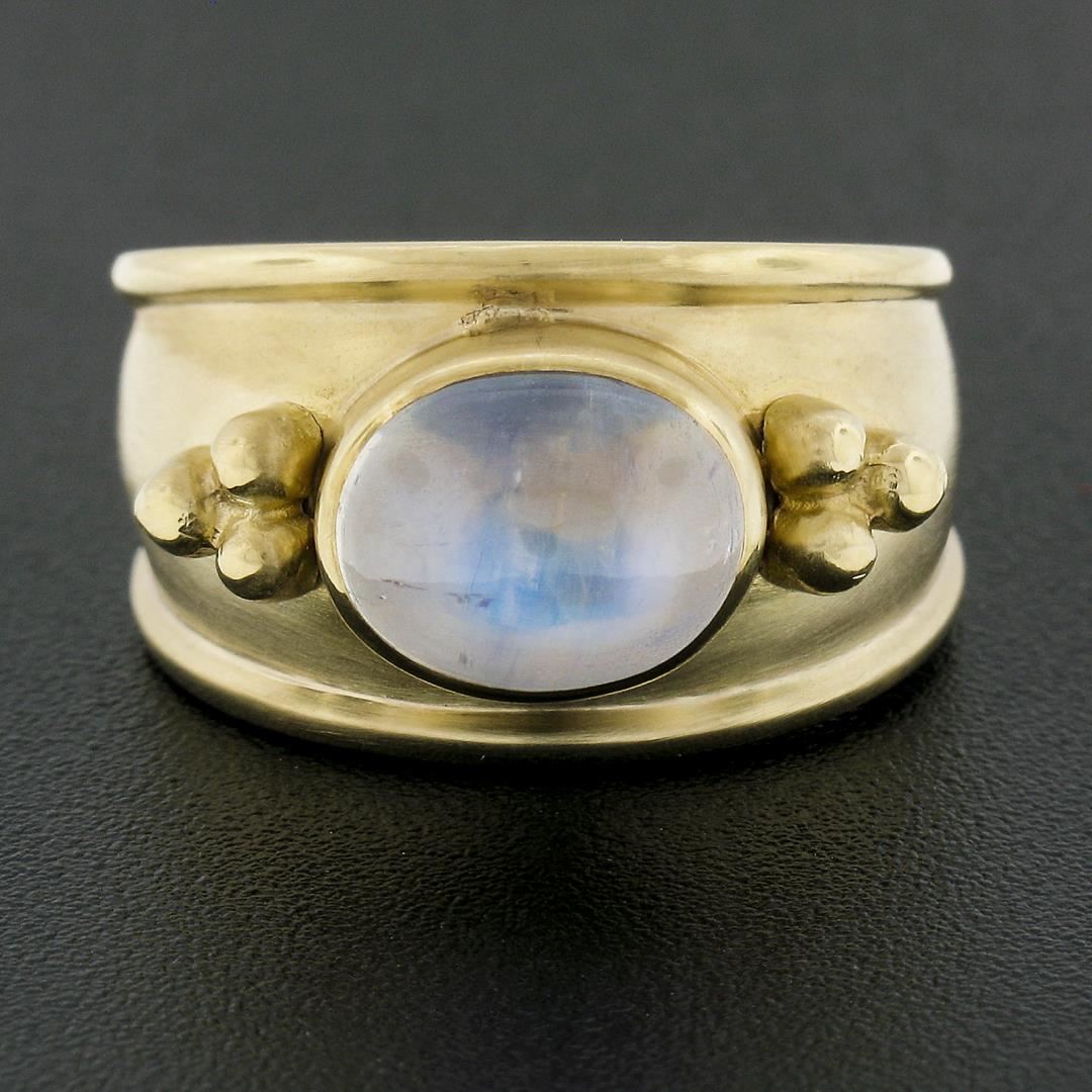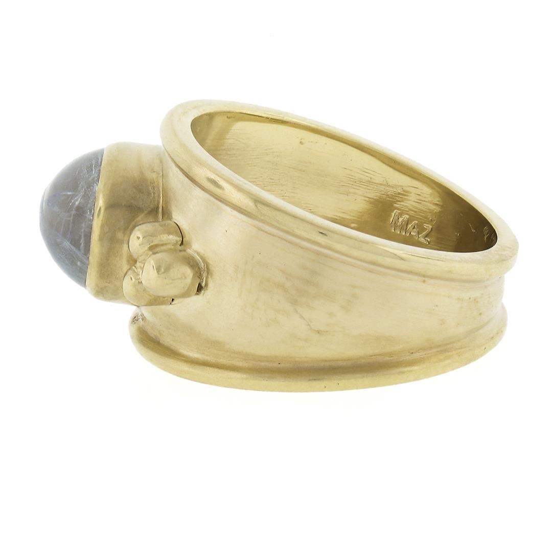 A solid 14k yellow gold cigar band ring by MAZ, with 1 oval cabochon cut natural moonstone (9.5x7.5mm). The ring is size 6.5, weighs a total of 8.61 grams, and measures 12.3mm wide.