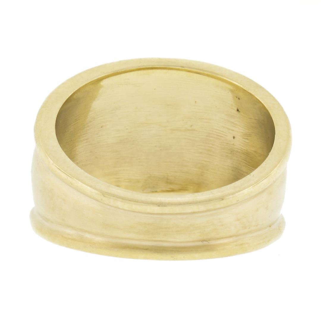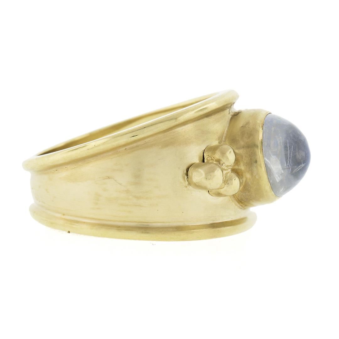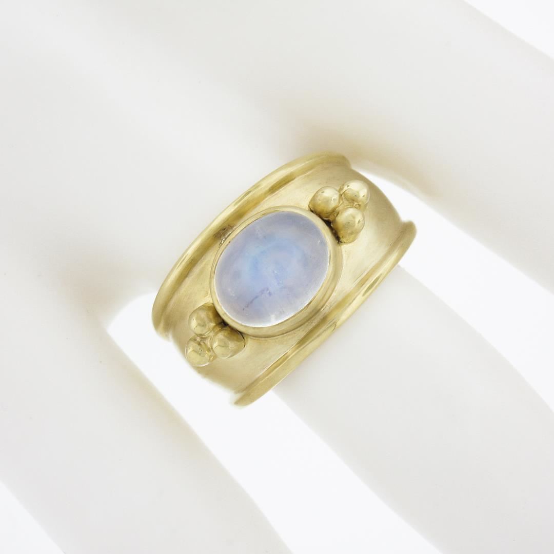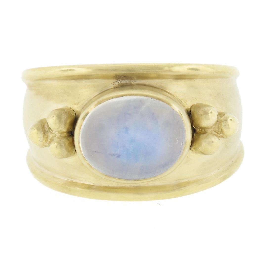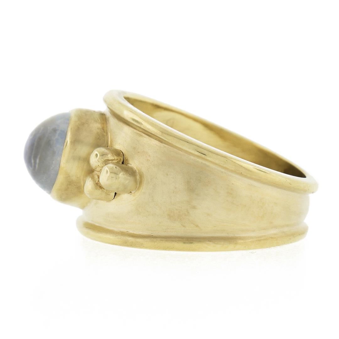 A solid 14k yellow gold cigar band ring by MAZ, with 1 oval cabochon cut natural moonstone (9.5x7.5mm). The ring is size 6.5, weighs a total of 8.61 grams, and measures 12.3mm wide.