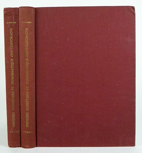 Mazard, Jean. HISTOIRE MONÉTAIRE ET NUMISMATIQUE CONTEMPORAINEÉ TOME I ET II: 1790-1967. Paris, 1965 and 1968. Two volumes. 4to, original matching maroon cloth, gilt. 294, (4); 310, (4) pages; numerous text illustrations. Bindings a bit rubbed; near fine. Clain-Stefanelli 8942.