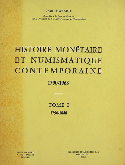 Mazard, Jean. HISTOIRE MONÉTAIRE ET NUMISMATIQUE CONTEMPORAINEÉ TOME I ET II: 1790-1967. Paris, 1965 and 1969. Two volumes. 4to, original printed card covers. 294, (4); 310, (4) pages; numerous text illustrations. First volume covers discolored at spine; very good or better. The card covered version. Clain-Stefanelli 8942.