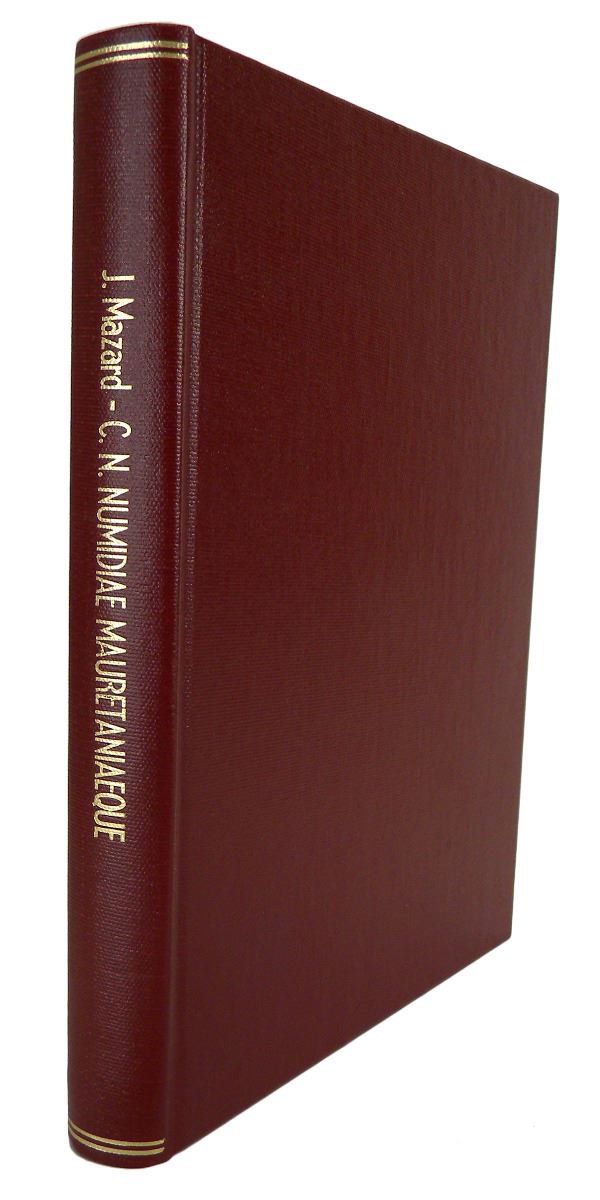 Mazard, Jean. CORPUS NUMMORUS NUMIDIAE MAURETANIAEQUE. Paris, 1955. 4to, later maroon cloth, gilt. 263, (3) pages, including a table of alphabets, a map, numerous text figures, and 28 fine héliogravure plates of coins. Previous owner's stamp; else fine. The standard reference. Clain-Stefanelli 3198*. Daehn 6777. Grierson 94. From the library of Tom Cederlind.