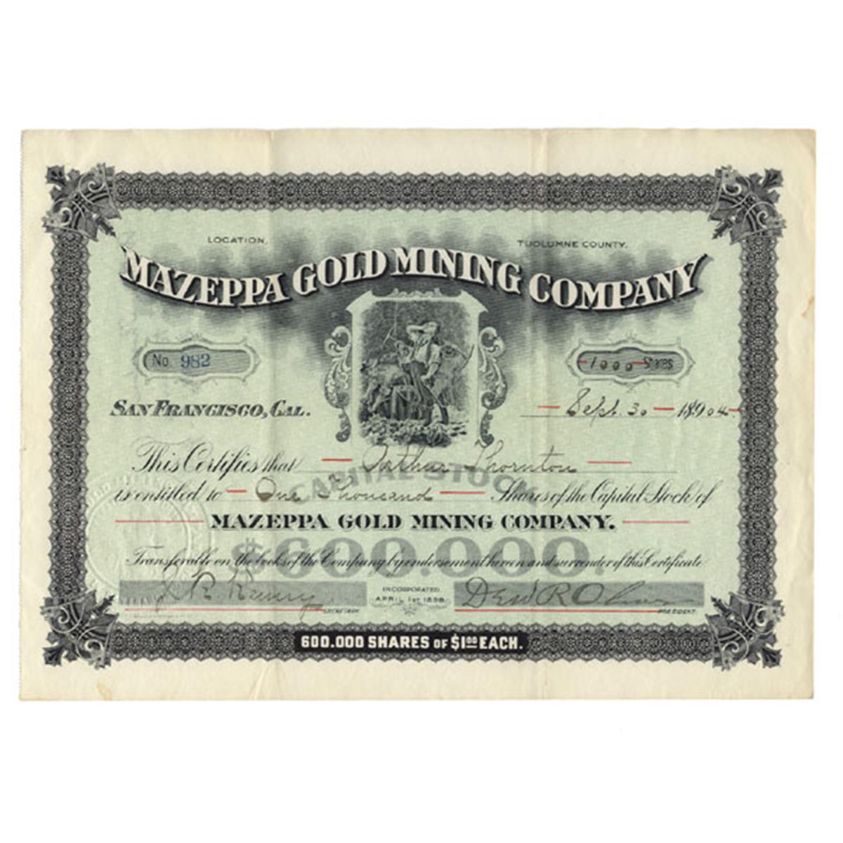 1904, California. Stock certificate for 1000 shares. Green/Black. Very attractive piece with top center vignette of miners at work. Mines located in Tuolumne County, California. Uncancelled and Excellent.
