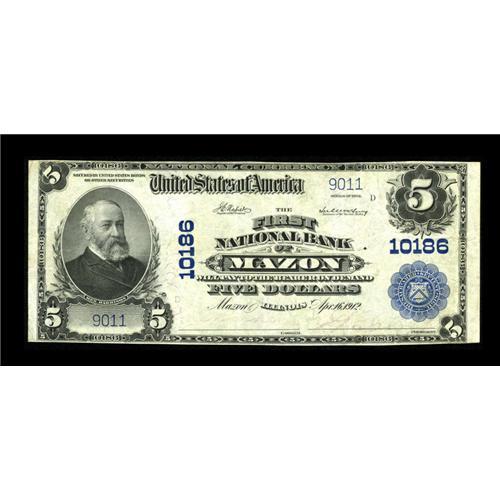 <B>Mazon, IL</B></I> - $5 1902 Plain Back Fr. 602 <B>The First NB</B></I> Ch. # 10186<BR>This one bank town in Grundy County was able to issue over $600,000 in Nationals and at its close in 1932, far less than 1% of that total was still outstanding in the form of large size notes. This piece is attractive and solid for the grade, though the signatures have faded. <B>Very Fine.</B></I><BR><I>From The Lincoln Collection</B></I><BR><BR><b>Shipping:</b> Coins & Currency (<a target="_blank" href="http://www.heritageauctions.com/common/shipping.php">view shipping information</a>)