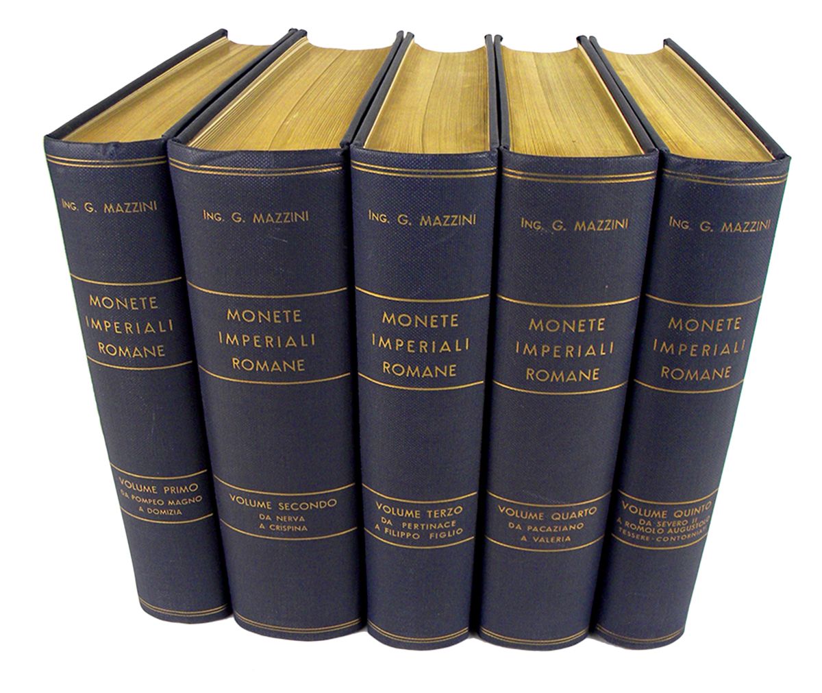 Mazzini, G. MONETE IMPERIALE ROMANE. Milano: Mario Ratto Editore, 1957-58. Five volumes, complete. Thick 4to, original matching blue cloth, gilt; top page edges gilt. xix, (1), 277, (3); ix, (3), 408, (4); ix, (3), 332, (4); xiii, (3), 365, (3); ix, (3), 327, (5) pages; 531 very fine phototype plates of coins. Near fine. A complete set of this outstanding work. One of only 500 sets issued. Clain-Stefanelli 4048: "From Pompey the Great to Romulus Augustulus, also tesserae and contorniates." Grierson 74. Kroh 72 (five stars): "This is the publication of the finest private collection of Roman coins ever assembled and it included 8,051 coins ... every one of them illustrated on 537 exceptional Collotype plates. Most of the really incredible coin-types and extreme rarities are included and the majority of them are in exceptional condition (including 1,261 gold coins and 1,641 large bronzes). The 1709 pages of Italian text is also very detailed."