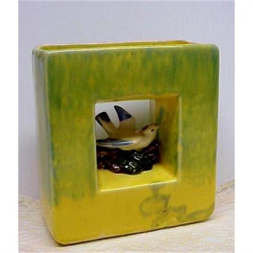 Gorgeous Art Deco very unusual rare vase, Love the tiny bird nested in the "window" of the vase - Beautiful mixture of a pastel green and sunny yellow color - Excellent condition, free of chips or cracks - It stands about 6 3/4" x 6" and 2 3/4" deep. - US Buyer to pay 8.00 for shipping + insce.We accept Paypal, Visa, Master Card or Money order - Thank You very much for looking!