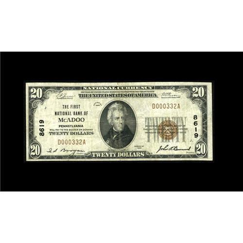 <B>McAdoo, PA</B></I> - $20 1929 Ty. 1 <B>The First NB </B></I> Ch. # 8619<BR>A solid <B>Very Fine</B></I> from the only issuer located here. This appealing note is problem free and will likely generate bids of about...