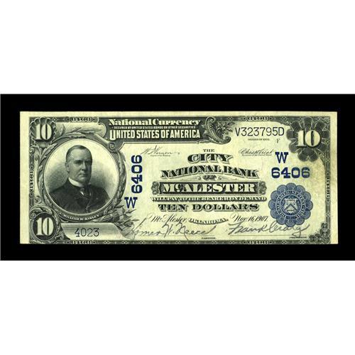 <B>McAlester, OK</B></I> - $10 1902 Plain Back Fr. 626 <B>The City NB</B></I> Ch. # (W)6406<BR>Seven notes are known from this large only bank, with this by far the nicest of that small group. <B>Extremely Fine,</B></I> with the bottom margin cut just a bit close.<BR><BR><b>Shipping:</b> Coin/Currency (<a target="_blank" href="http://www.heritageauctions.com/common/shipping.php">view shipping information</a>)