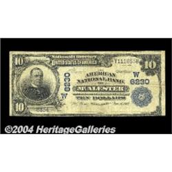 McAlester, OK - $10 1902 Plain Back Fr. 626 The American NB Ch. # 6230This scarcer large size-only bank reports less than ten state issue notes to the census. Fine, with barely visible sigs and a tight trim at the bottom, but otherwise flawless for the grade. <BR><BR><B>Important notice:</B> Heritage usually auctions material at the rate of 200-250 lots per hour. On some occasions eBay Live bid software or the Internet may not be able to keep up with the pace of the auction. We recommend placing a realistic absentee bid now as insurance to avoid disappointment. Occasionally the auctioneer may eliminate or reject an eBay Live bid, and the auctioneer may also reopen a lot after the close of the eBay live bidding (usually because we missed an audience bid), and may reject your bid even if it shows you as the winning bidder. By bidding via eBay Live, you agree that Heritage may award the lot to another bidder at its sole discretion under the circumstances described above or any other reasonable circumstances. Since eBay bids are not shown to us until we open the lot on the floor, we treat those bids just like floor bids. In most cases the floor responds before the eBay bid is presented to us, due to Internet lag time, so for consistency we have made it a policy that floor bids are always considered first over tie eBay live bids. Also please note that all Heritage lots purchased through eBay Live carry a 20% Buyer's Premium. Please make sure you read the Terms and Conditions before you bid. <BR><BR><B>IMPORTANT ANNOUNCEMENT ABOUT RESERVES:</B> Heritage now divulges all reserves on its web site 7 days before every auction. If you want to know whether the reserve on this lot has been met, and if not, what the reserve amount is, please visit this lot page on the HeritageCoin.com web site, or email: bid@HeritageGalleries.com
