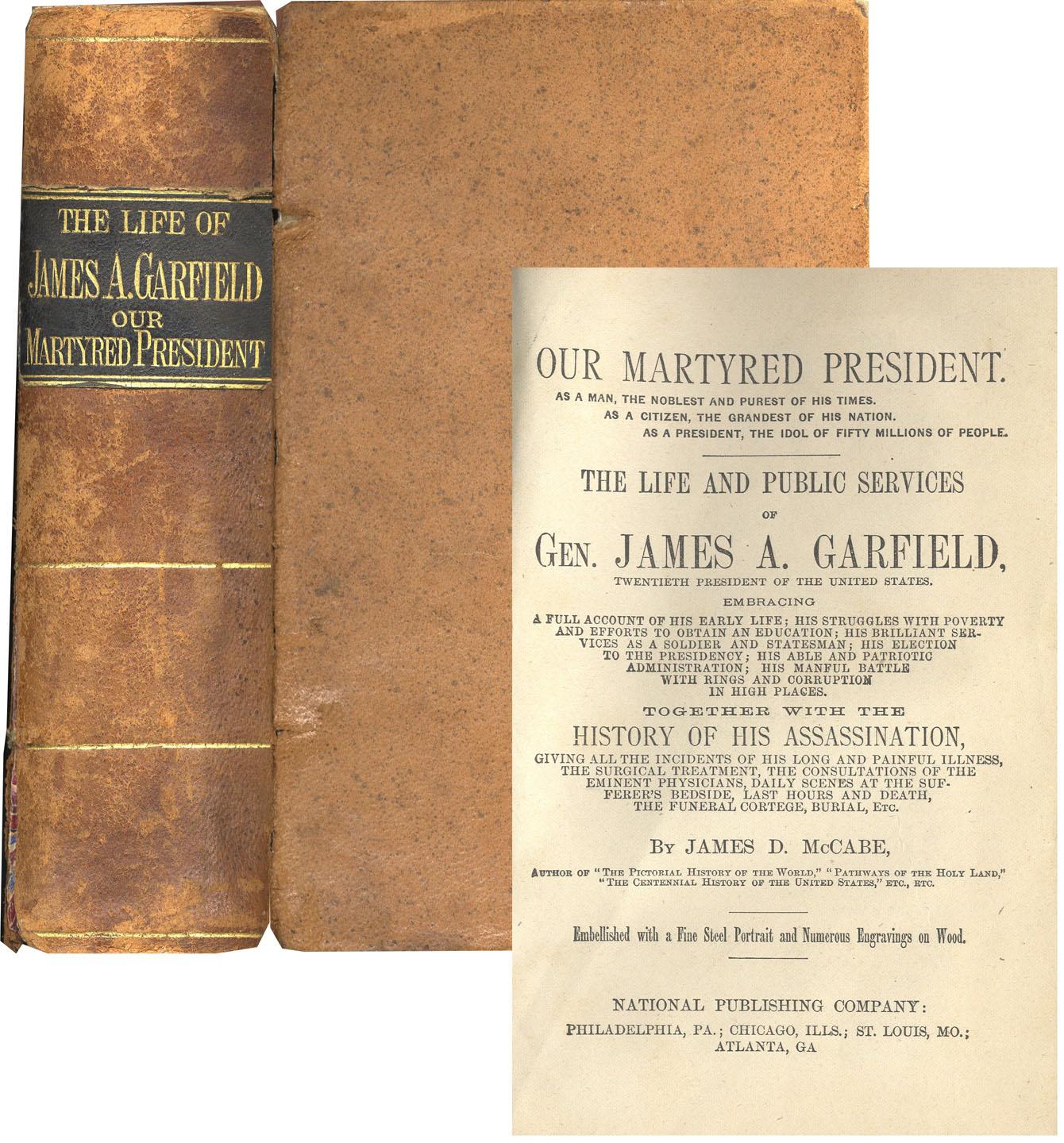 ''The Life of James A. Garfield, Our Martyred President'' by James D. McCabe. National Publishing Company: 1881. Illustrated with numerous engravings and decorated with marbled ffep. Edition, measuring 5'' x 8'', runs 768pp. Book memorializes Garfield's 2 July 1881 assassination by the pistol of Charles J. Guiteau. Leatherbound covers and gilt to spine. Covers detaching and corners worn. Toning to interior and some nicks to covers and spine, yet binding tight. Overall good condition.